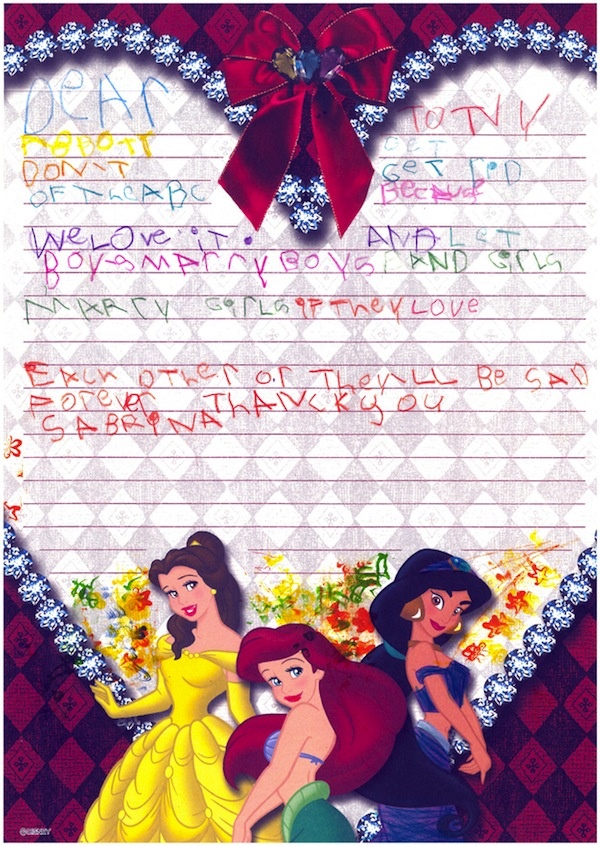 Sabrina, một bé gái 4 tuổi tại Úc sau khi phát hiện ra hôn nhân đồng tính ở nước mình được cho là không hợp pháp đã rất bất bình. Cô bé quyết định viết một bức thư gửi đến Thủ tướng chính phủ phản ánh về điều này.