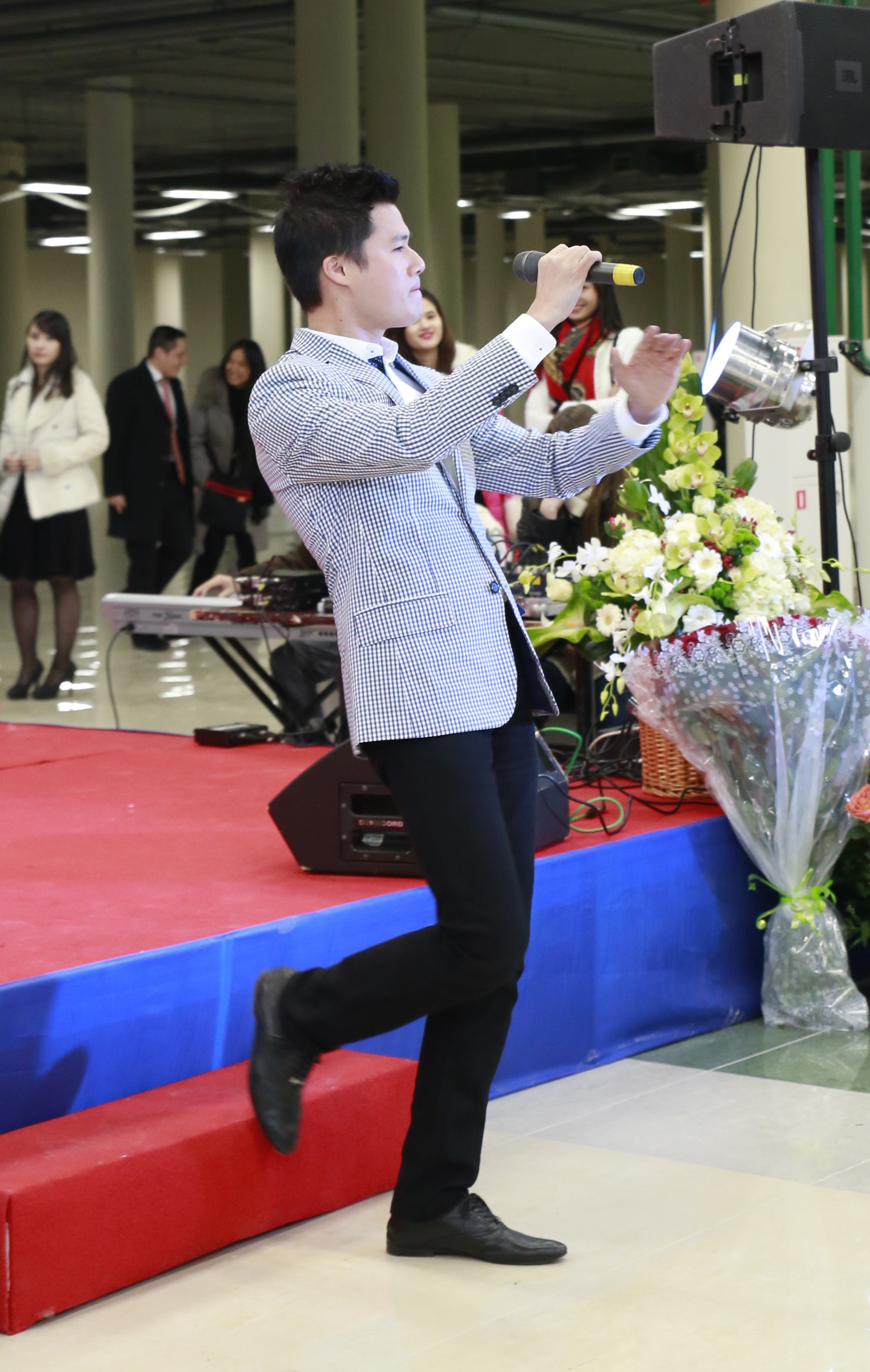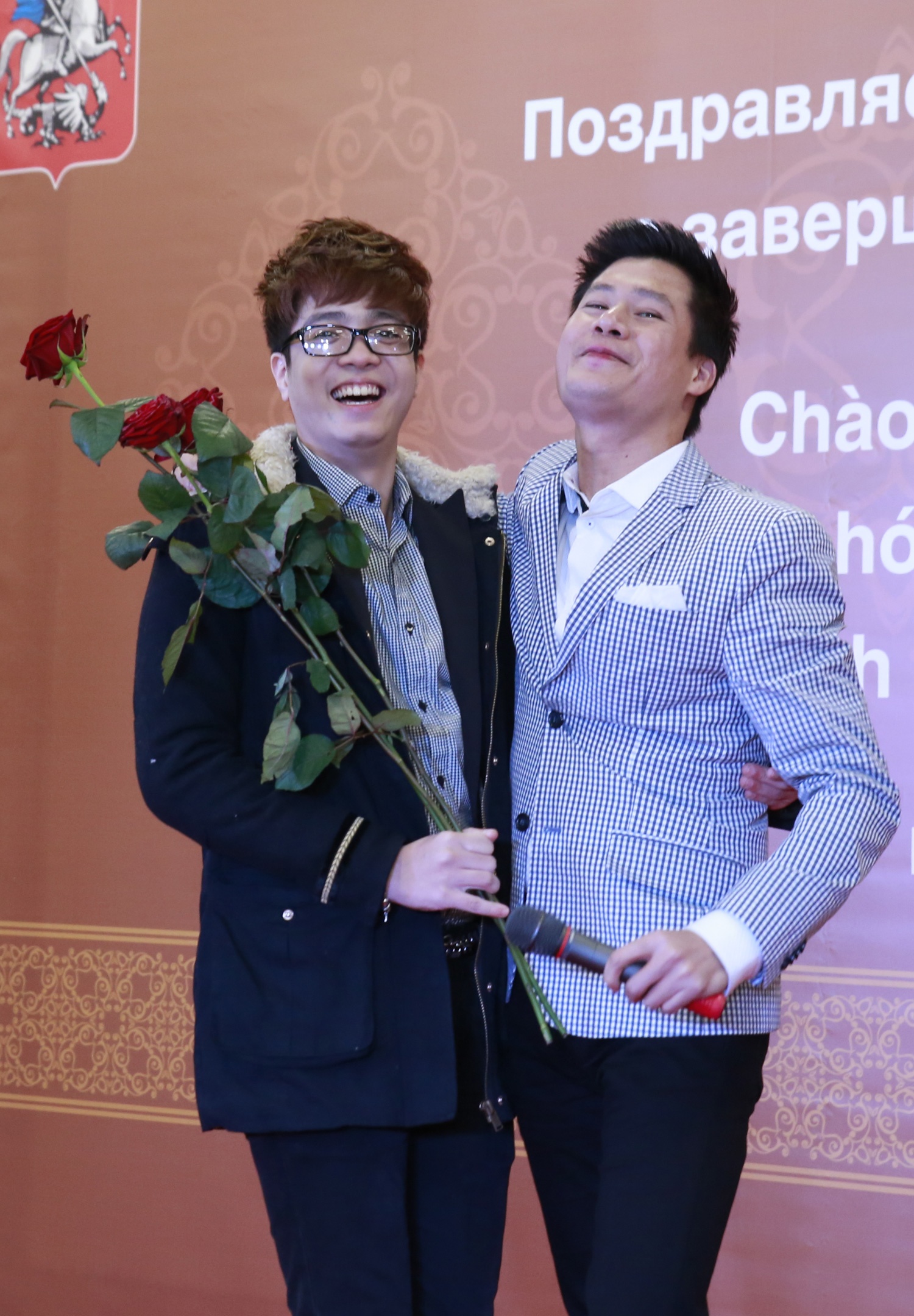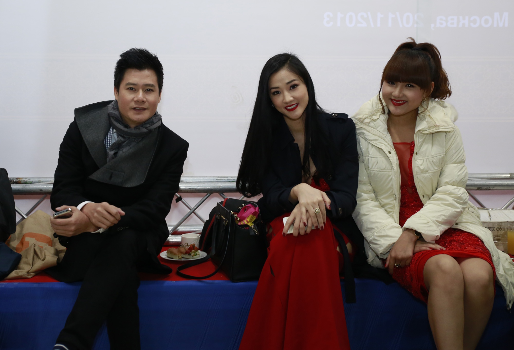 | Ngồi sau sân khấu chờ tới lượt diễn. Thời tiết ở Nga lúc này khá lạnh nên anh mặc áo ấm cẩn thận. |