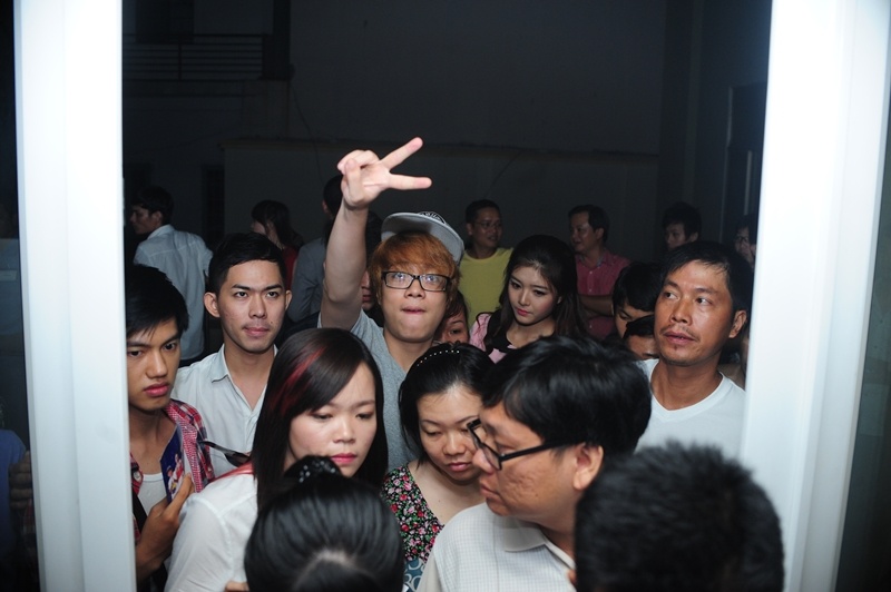 | Bùi Anh Tuấn xuất hiện ở trường quay của The Voice Kids khi khán giả đang tấp nập đổ về đây. Anh chàng gần như lọt thỏm giữa đám đông ở cửa ra vào của trường quay Hãng phim Giải Phóng nhưng vẫn cố vươn cao cánh tay và tạo thành hình chữ V để chào hỏi cánh phóng viên đang vất vả tác nghiệp. |