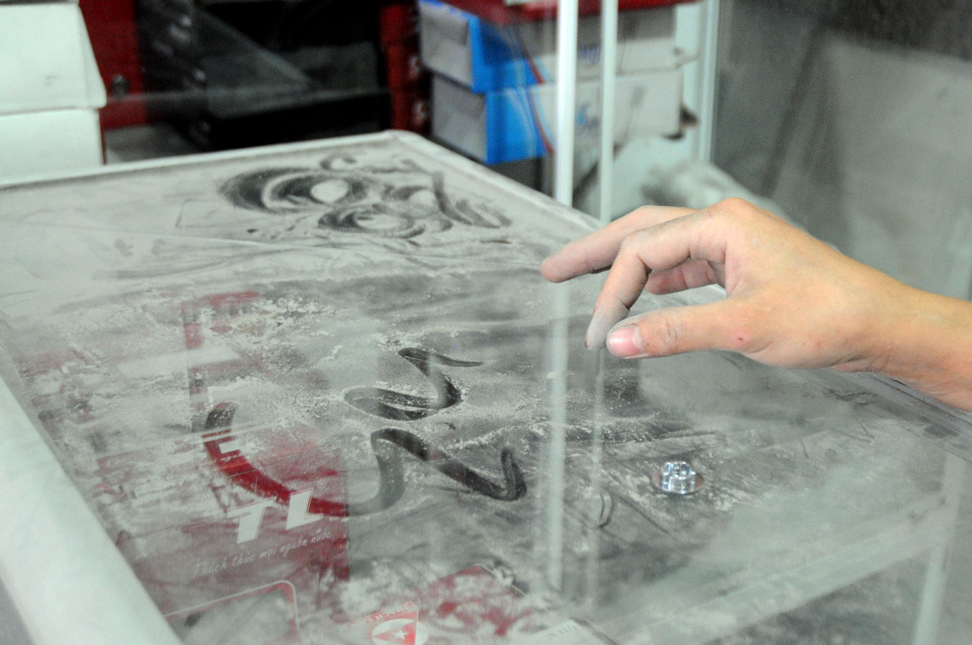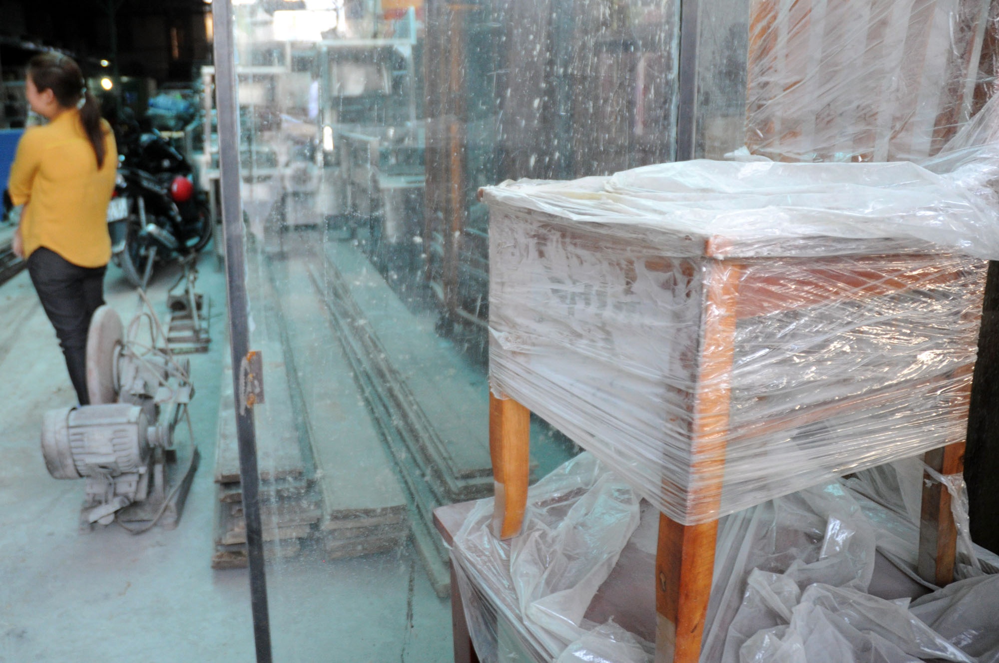 | Bụi bay dày đặc, tấn công vào nhà dân và các hộ kinh doanh hai bên đường khiến việc buôn bán trở nên ế ẩm. Trong ảnh là đồ nội thất của cửa hàng chị Xuyến bị bụi đường bám khắp nơi. |