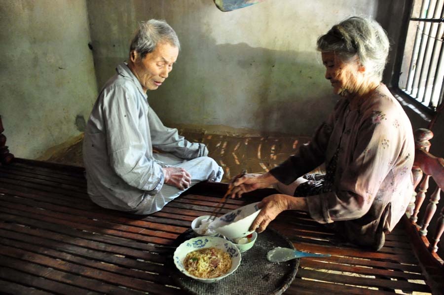 | Hai vợ chồng già ăn gói mì tôm với cơm để qua bữa. |
