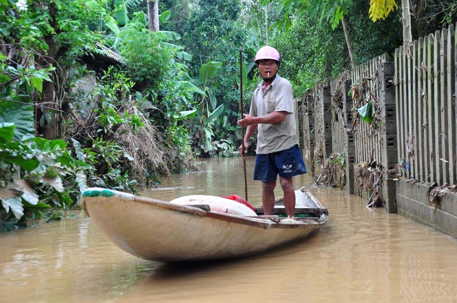 | Dù lũ rút nhưng đường xá vẫn còn ngập nên người dân phải dùng thuyền đi lại. |