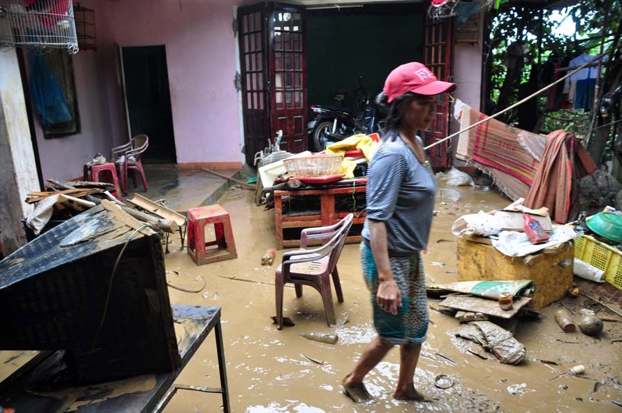 | Người phụ nữ dọn dẹp đống đổ nát. Tất cả các vật dụng trong nhà của chị bị hư hỏng nặng vì lũ lên quá bất ngờ. |