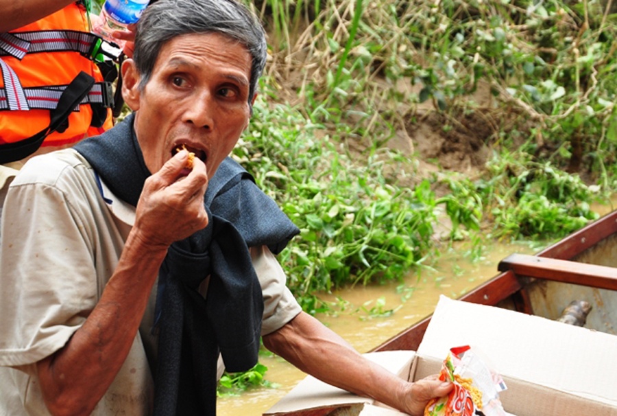 Trong vòng chỉ khoảng 1 giờ, nước từ sông Trà Khúc tràn vào và dâng cao cả mét, rồi lên 2 - 3m. Nhiều gia đình trở tay không kịp chỉ còn cách leo lên nóc ngồi và cầu trời. Toàn bộ thóc lúa, lương thực dự trữ cho mùa mưa bị nước lũ làm ướt, hư hỏng và trôi sạch. Ngay cả mì tôm nhiều gia đình cũng không còn.