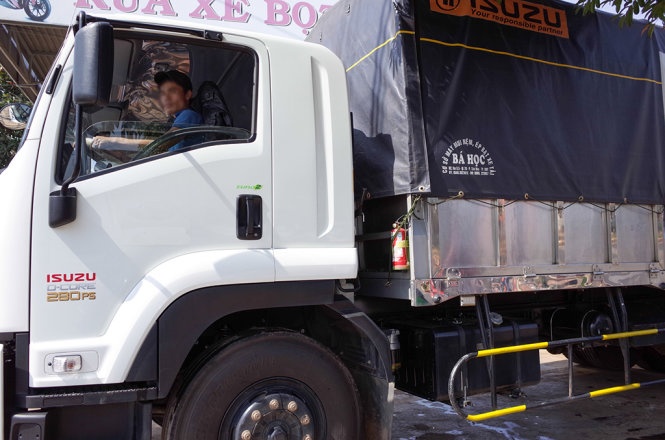 Xe tải trọng 15 tấn nhưng chỉ trang bị bình mini loại 1 lít, của Trung Quốc sản xuất. Hỏi ra mới biết, trước đây tài xế đặt bình trong xe nhưng mỗi lần CSGT kiểm tra phải vào cabin bất tiện quá nên treo luôn bên ngoài do dễ thấy.