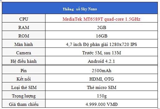 Sky Nano sử dụng bộ vi xử lý quad-core MediaTek MT6589T với tốc độ 1,5 GHz, hiệu suất đã được cải thiện so với MT6589 thông thường. Bộ nhớ RAM và ROM lần lượt là 2GB và 16GB.