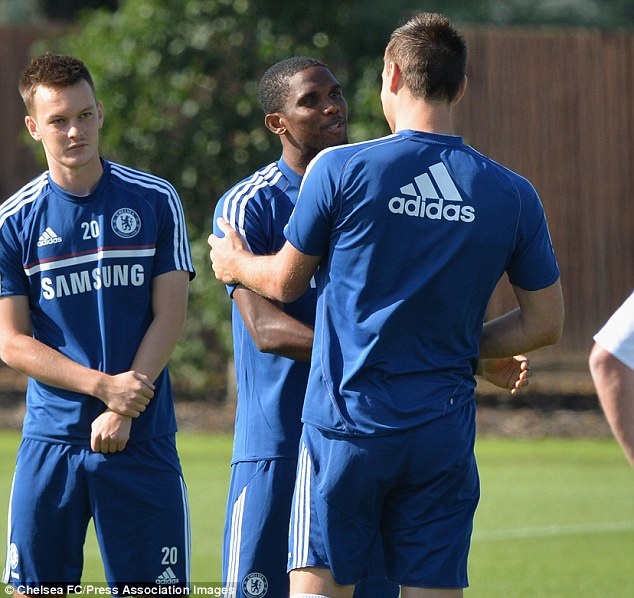 | Eto'o được các đồng đội mới tại Chelsea nồng nhiệt chào đón. |