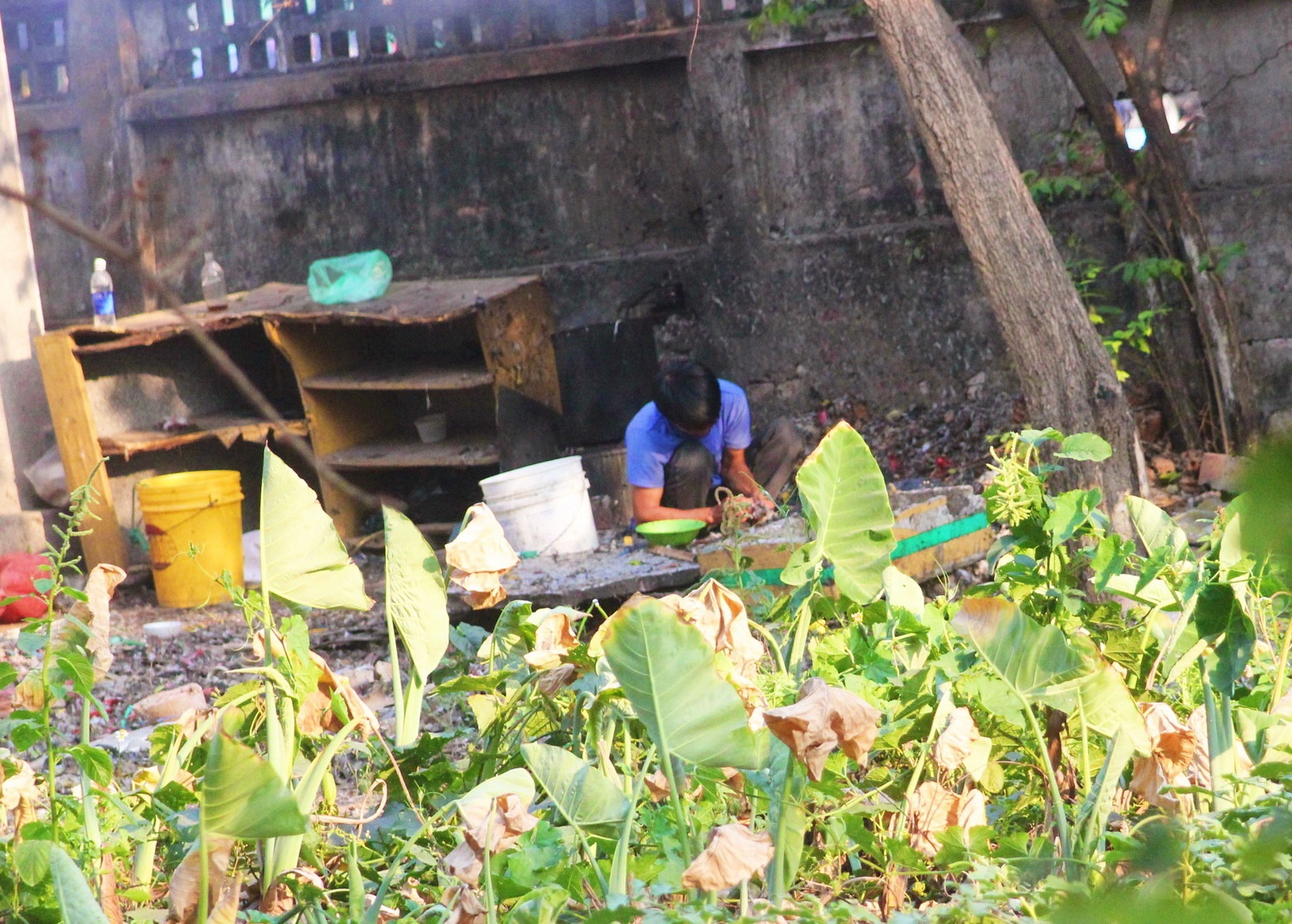 Sau khi mua, nếu khách có nhu cầu giết mổ hoặc cắt tiết để làm tiết canh thì chỉ cần chờ khoảng chục phút sẽ có. Theo quan sát, tại khu vực nghĩa địa Bình Hưng Hòa, xen lẫn với những ngôi mộ là các "lò" giết mổ gia cầm lậu, dụng cụ là chiếc xô đựng nước, bếp, thuốc hãm tiết đông và lông gà vịt khắp nơi. Ảnh: Một người đàn ông mang vịt vào "lò" mổ trong nghĩa địa để cắt tiết cho khách.