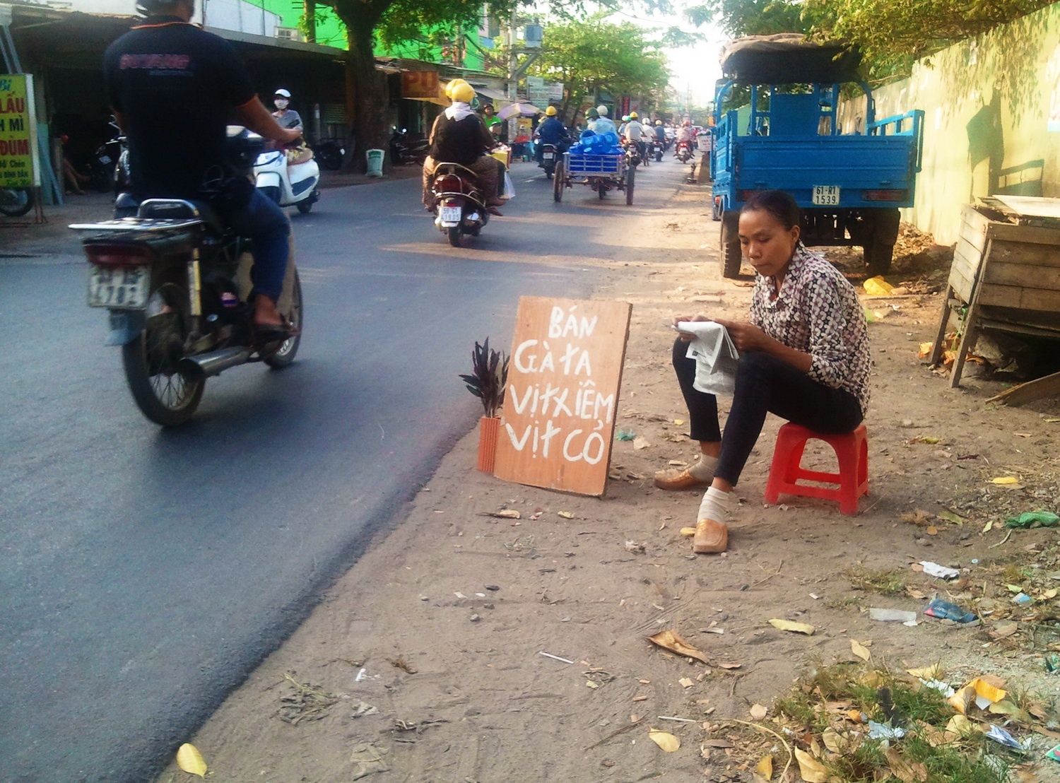 | Mặc dù các cơ quan chức năng quận Bình Tân và Tân Phú thường xuyên ra quân dẹp bỏ điểm đen buôn bán, giết mổ gia cầm này nhưng chỉ là "bắt cóc bỏ dĩa". Người kinh doanh lợi dụng cả khu vực nghĩa trang với nhiều bụi cây um tùm làm chỗ cất giấu. Ảnh: Chiều 18/2, trên đường Bình Long, ngoài các điểm bán công khai, xuất hiện nhiều "ám hiệu" bán gà nằm rải rác tại khu vực này. |