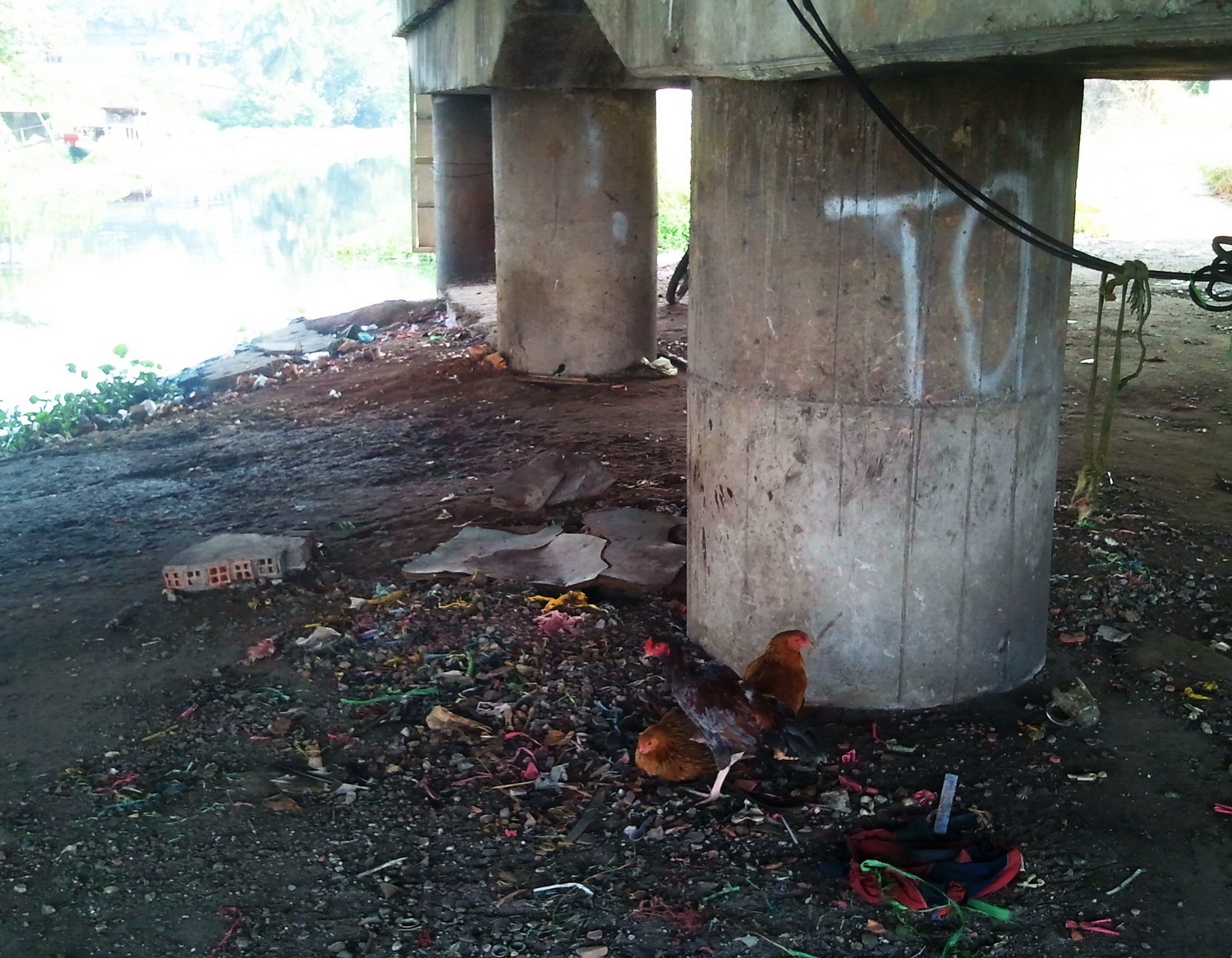 | Khi khách tỏ ý muốn mua thì lập tức những người này tới các điểm giấu để lấy hàng. Trong ảnh: Một số con gà được cột chân dưới dạ cầu. |