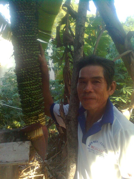 Ông không rõ tên giống cây chuối này, chỉ thấy trái tương tự giống chuối cau địa phương nhưng thân cao lớn hơn nhiều.