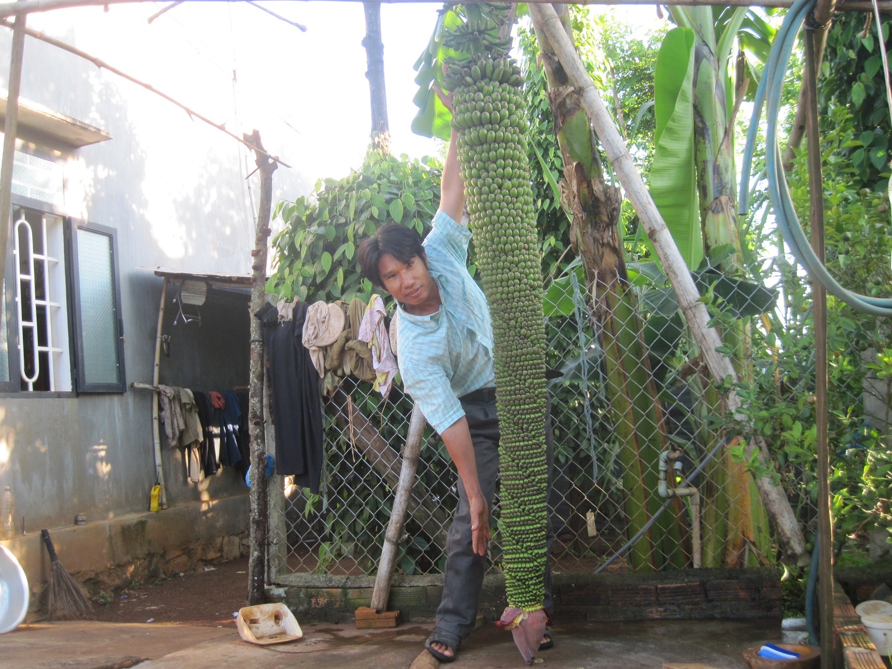 | Anh Trần Thanh Hải (ở thôn 4, xã Ea Kao, TP.Buôn Ma Thuột, Đắk Lắk) cho biết, đây là cây chuối được anh mua về trồng ở vườn nhà hơn 1 năm. Bốn tháng trước, cây chuối bắt đầu trổ bắp và ra quả. Hiện, buồng chuối dài khoảng 2 m và có hơn 150 nải. Mỗi nải có từ 16 trái trở lên. Kỳ lạ là cứ mỗi sớm mai thức dậy, buồng chuối lại có thêm 2 nải mới. |