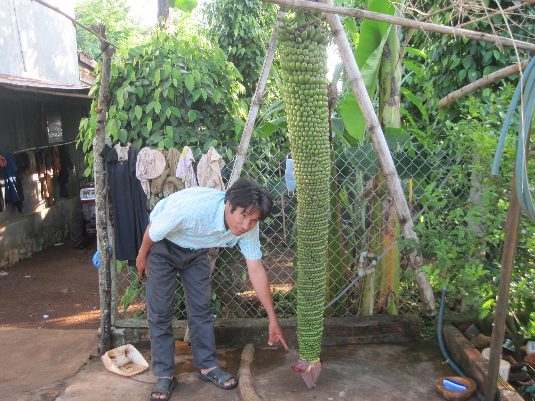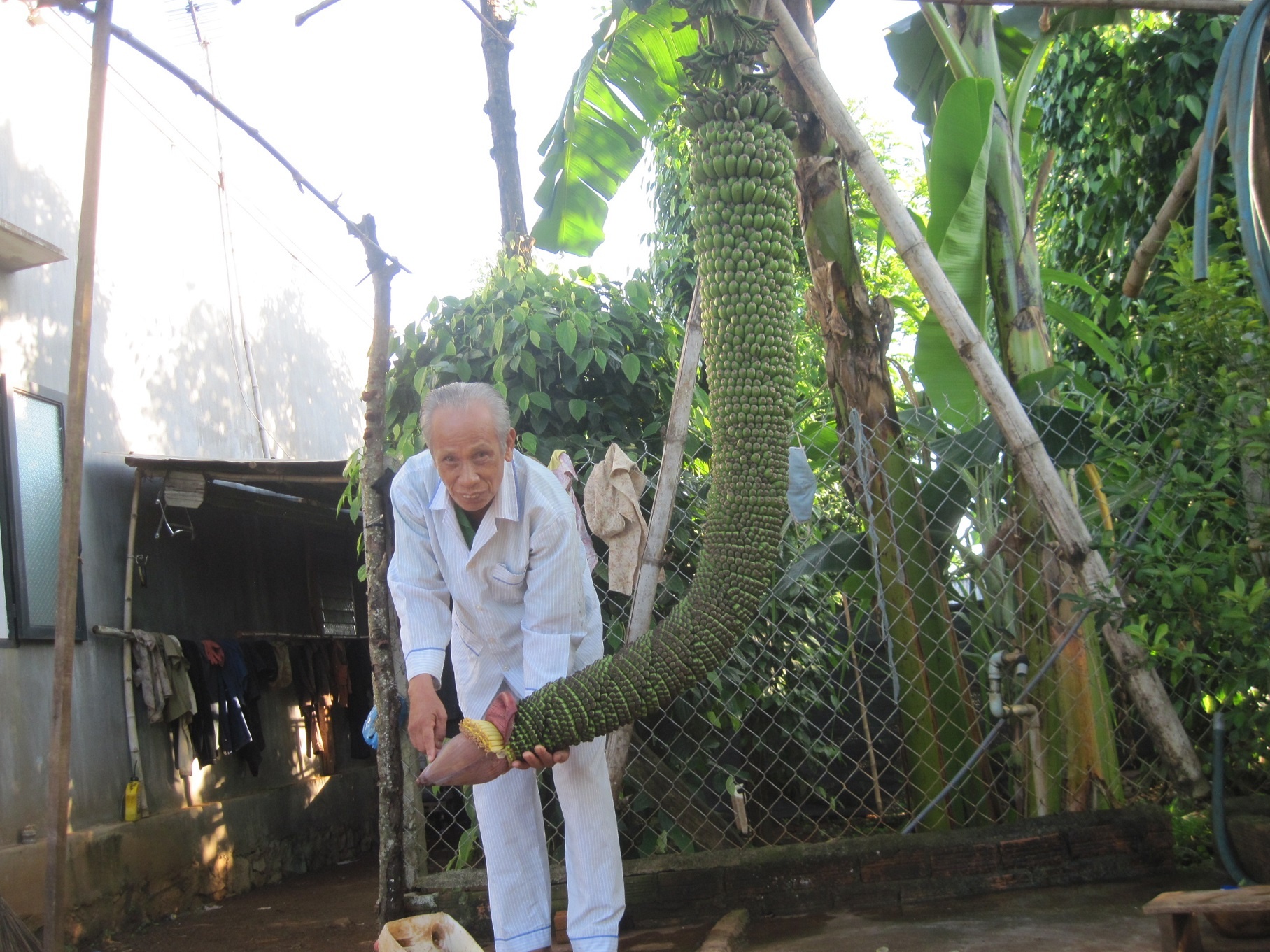 | Buồng chuối siêu nải thu hút khá nhiều người đến ngắm và xin chụp hình làm kỷ niệm. Ngày nào nhà anh Hải cũng có hàng trăm người đến xem. Có người hỏi mua giá vài triệu đồng nhưng anh không bán. |