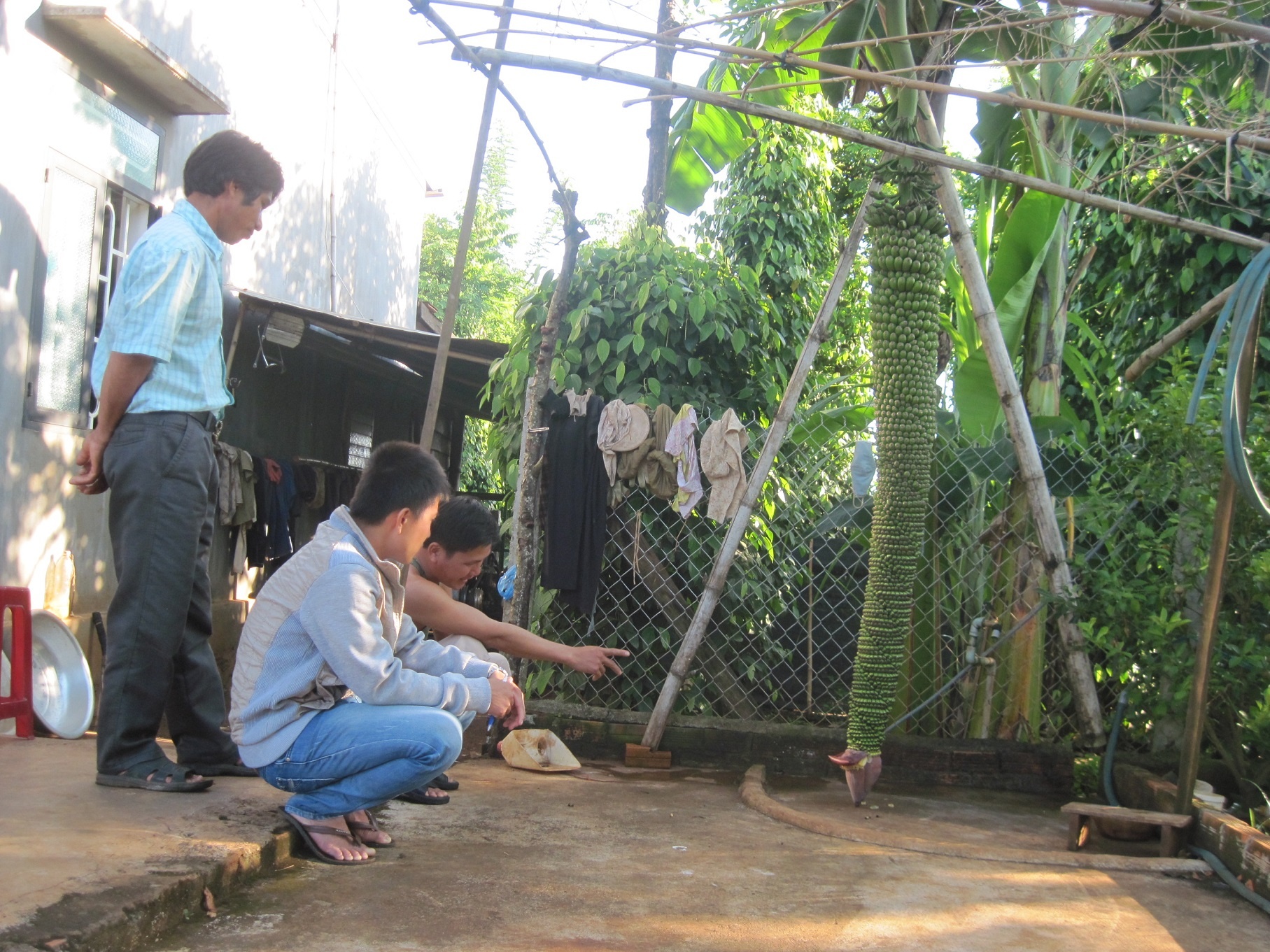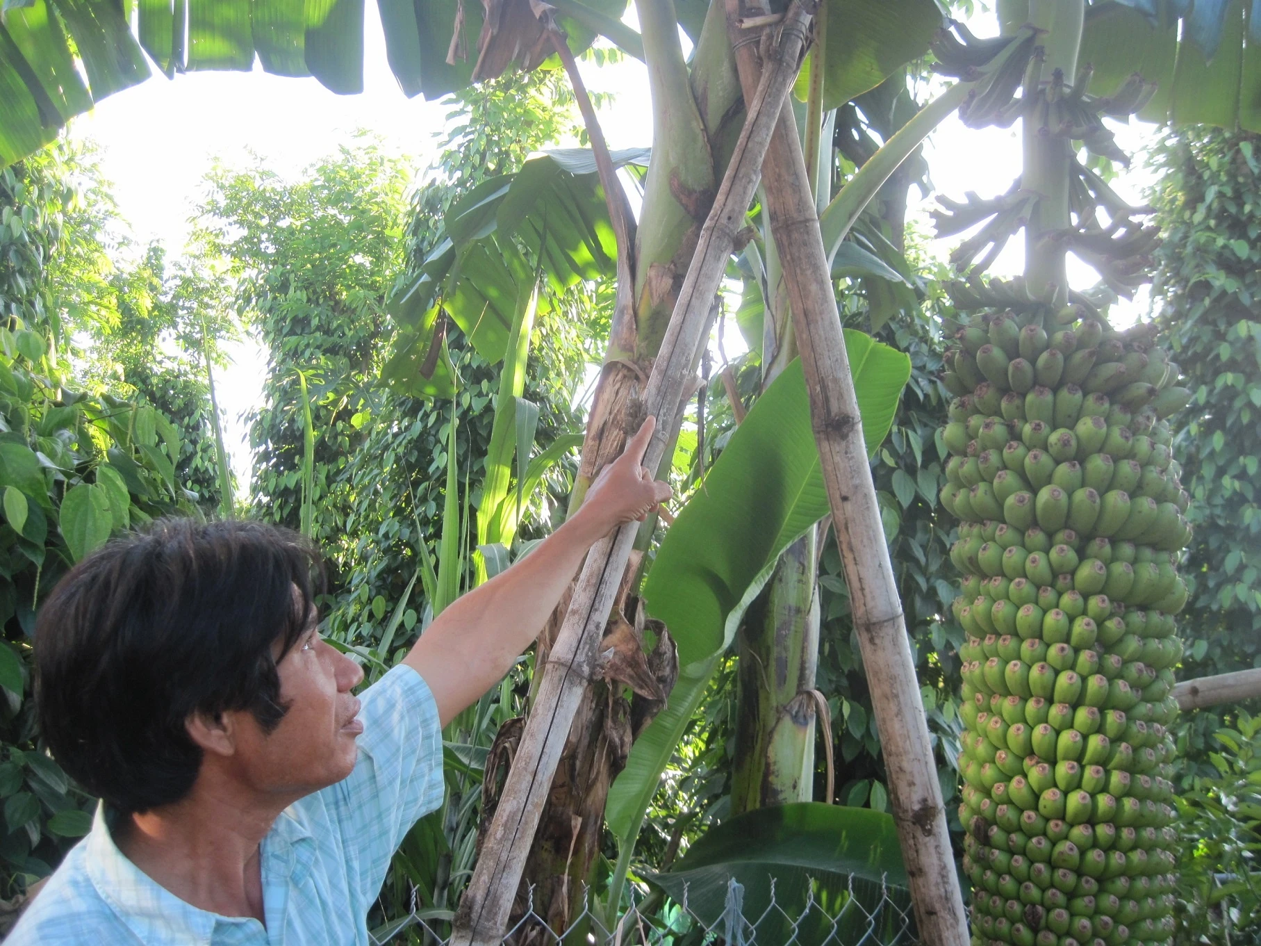 | Vì buồng chuối rất nặng nên anh Hải phải dùng cọc tre để làm giá đỡ. |