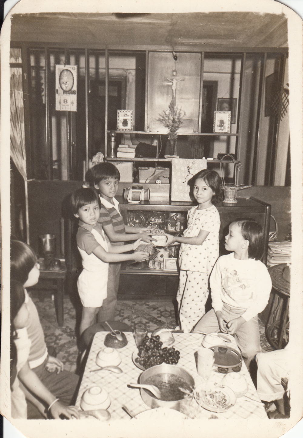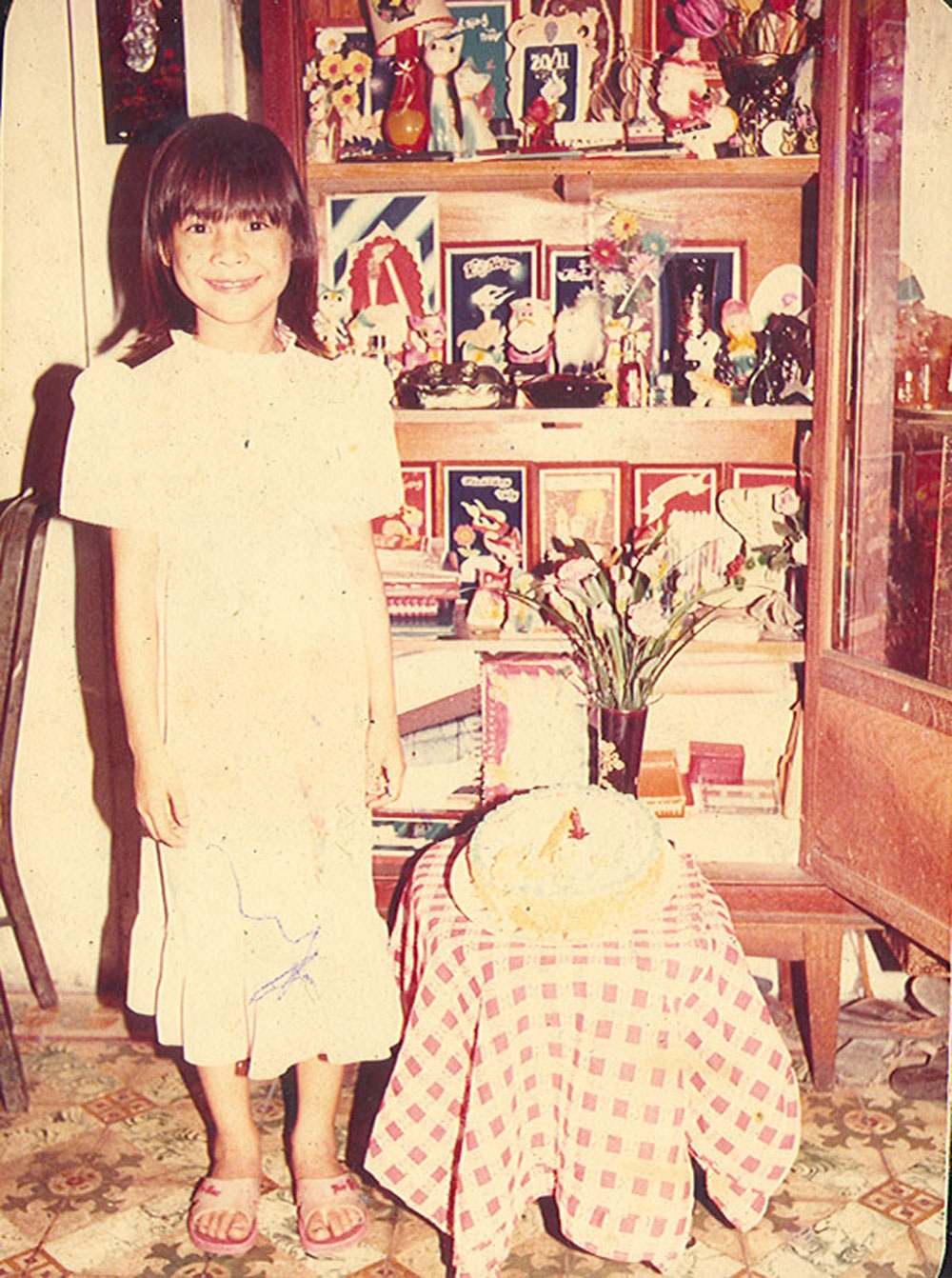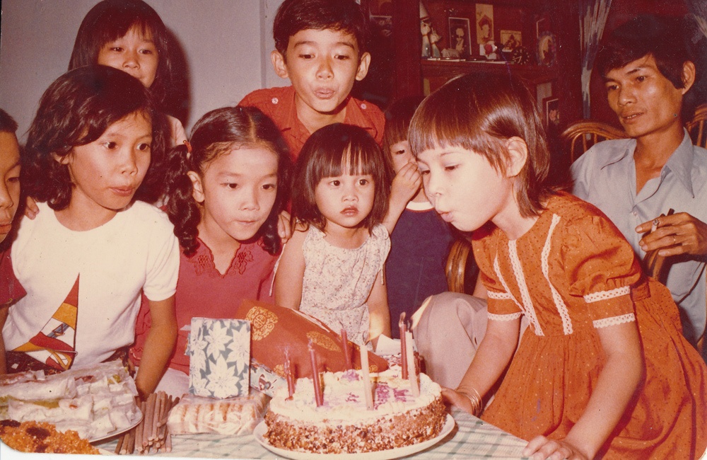| Thanh Thảo chụp hình cùng bạn "thiếu nhi" trong một lần sinh nhật. Hồi bé, cô gầy và đen nhẻm. |