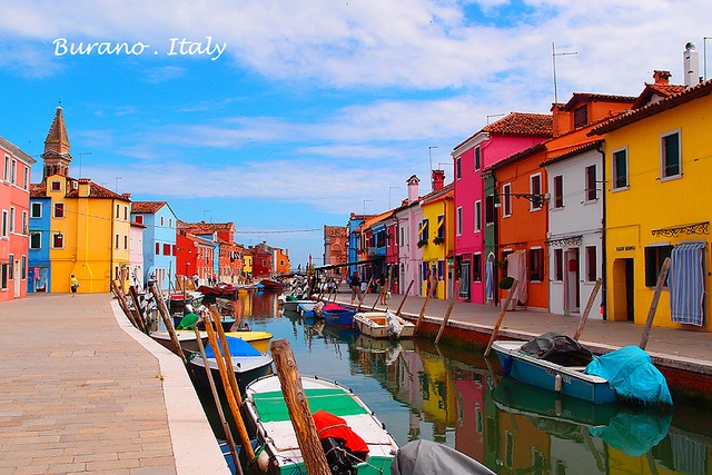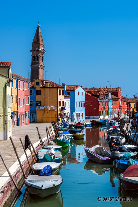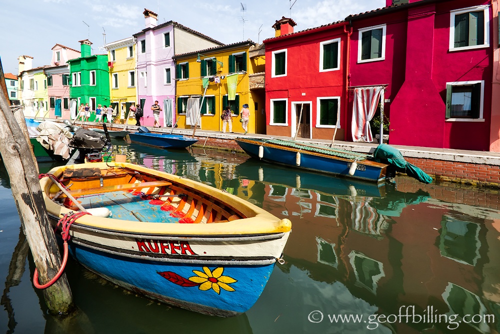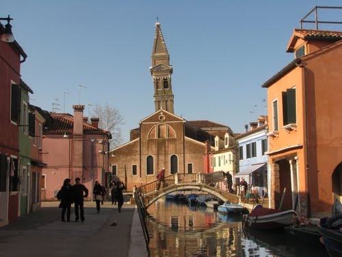 Con đường chính trên đảo Via Galuppi với các cửa hàng lưu niệm, bar, nhà hàng cũng được sơn phết sặc sỡ, dẫn đến quảng trường trung tâm. Đây là nơi khách du lịch tập trung đông nhất trên đảo. Hầu như trên đảo, chỉ có nhà thờ San Martino là giữ nguyên màu đất không sơn phết, nhưng lại có một điểm thu hút riêng đó là tháp chuông nghiêng cao nổi bật có thể nhìn thấy từ xa.