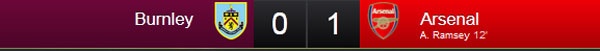 12': Arsenal vượt lên dẫn trước chủ nhà Burnley sau 3 cú sút liên tiếp. Tác giả của bàn mở tỷ số là tiền vệ Ramsey.