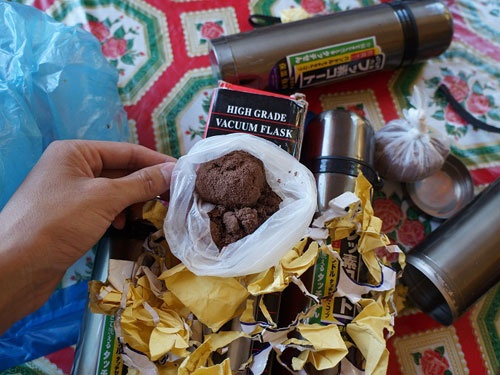 | Trong đáy bình phích có chứa gói chất lạ. |