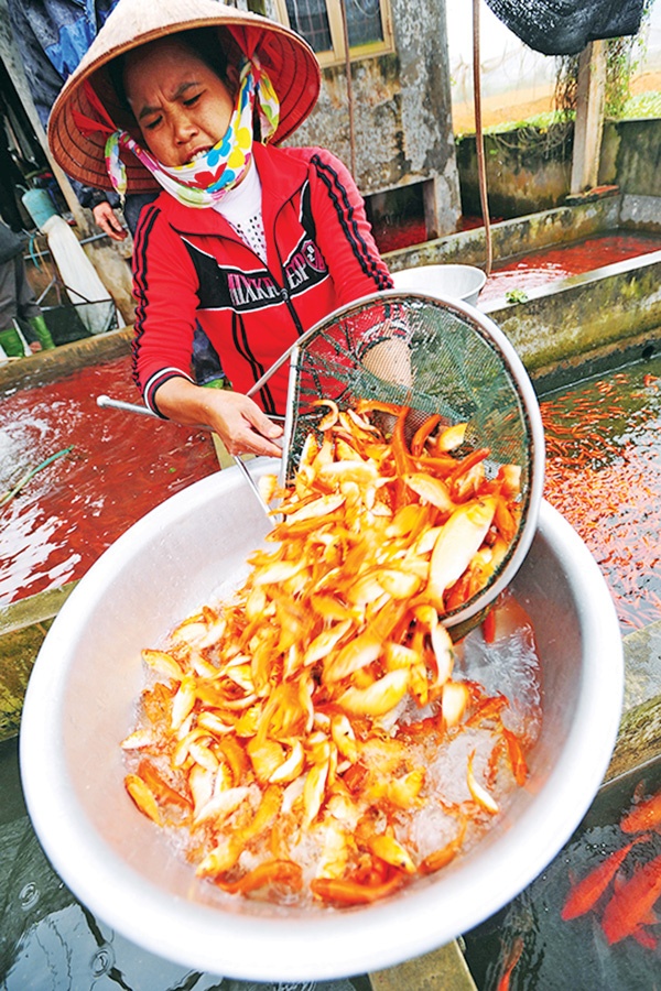 Nói đoạn, chị này dẫn chúng tôi vào mấy bể cá trong nhà rồi nói: “Năm nay nhiều người thả cá màu vàng giá khoảng 200.000 đồng/đôi”. Theo chị này, bình thường người dân mua cá chép đỏ do giá bình dân; còn người cầu kỳ hay có phần mê tín, chọn loại cá chép màu.