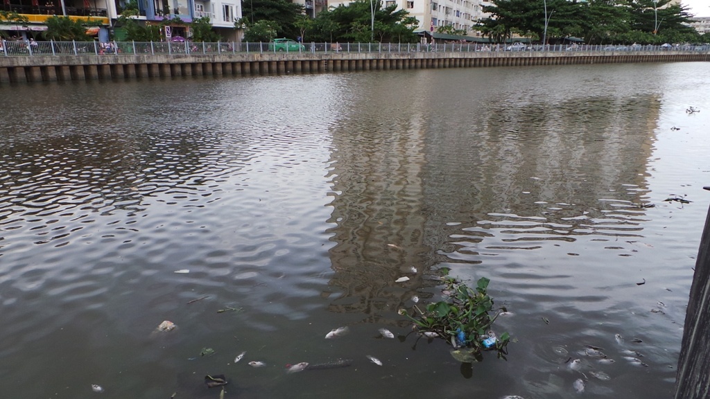 | Cá chết trôi ngang đoạn kênh qua khu chung cư Miếu Nổi trên đường Trường Sa (quận Phú Nhuận). |