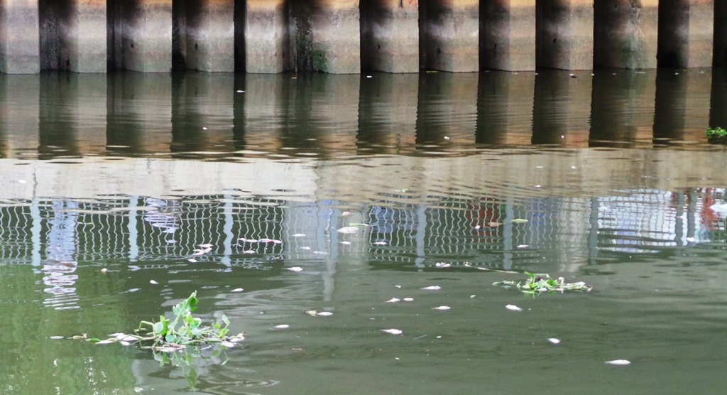 | Phần lớn xác cá trôi theo dòng nước, nhưng có một số khác tấp vào các rãnh 2 bên bờ kênh. Khi phân hủy, xác cá sẽ khiến môi trường nước ô nhiễm, ảnh hưởng đến cuộc sống người dân. |