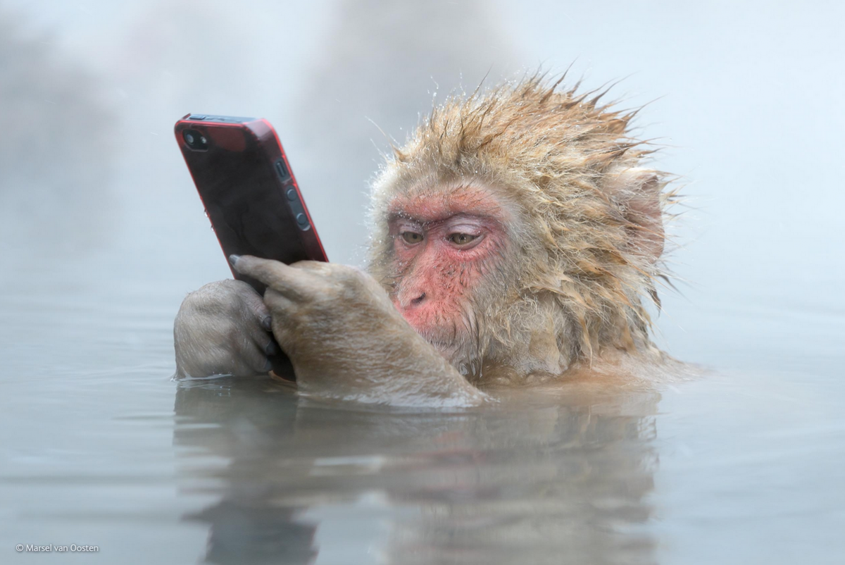 Khỉ nghịch điện thoại thông minh trong suối nước nóng của tác giả Marsel van Oosten người Hà Lan. |
