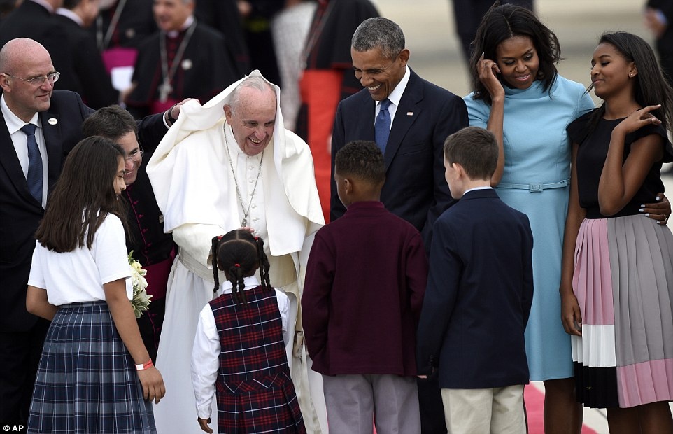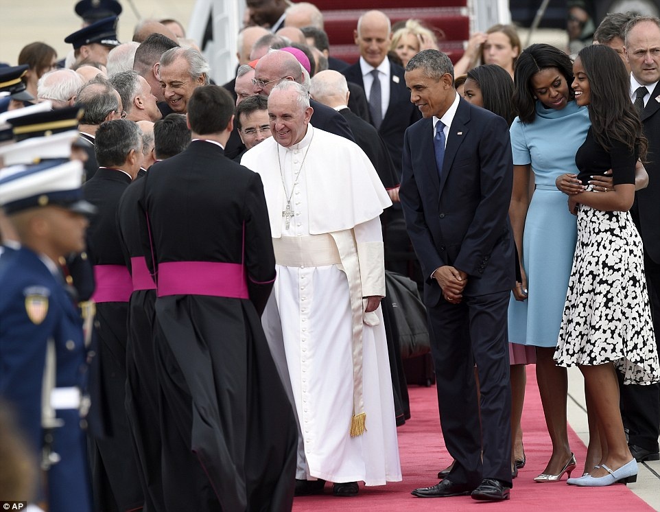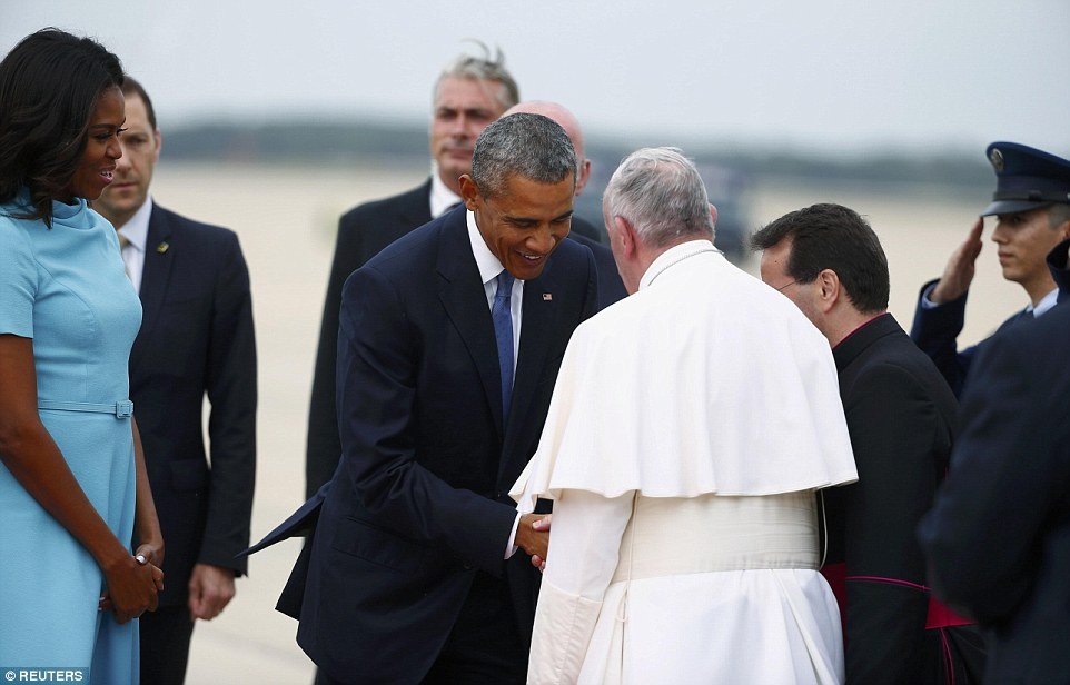 | Tổng thống Obama, Đệ nhất phu nhân Michelle đón tiếp Giáo hoàng tại sân bay. Trước đó, Giáo hoàng đã đến Cuba và ủng hộ nước này tiếp tục tiến trình hòa giải với siêu cường hàng đầu thế giới. Ông cũng là một trong những người hỗ trợ về đột phá ngoại giao giữa Mỹ và Cuba hồi tháng 12 năm ngoái. Ảnh: Reuters |
