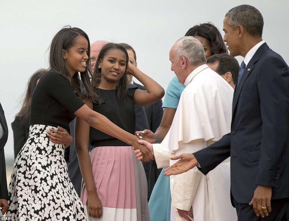 | Hai con gái Sasha và Malia cũng theo bố mẹ ra sân bay để đón Giáo hoàng Francis. Đây là lần đầu tiên toàn bộ thành viên trong gia đình đệ nhất cùng ra tận sân bay để đón chào một quan khách tới thăm. Ảnh: Reuters |