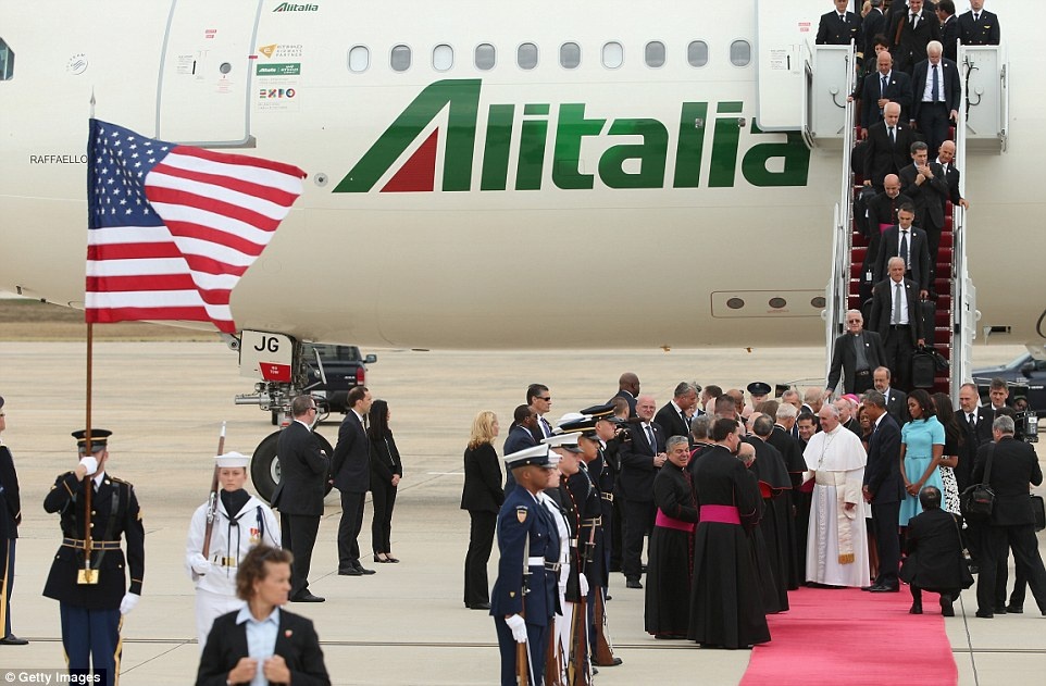 | Toàn cảnh buổi đón Giáo hoàng Francis tại sân bay ở ngoại ô thủ đô Washington. Tổng thống Obama sẽ tiếp đón chính thức Giáo hoàng tại Nhà Trắng vào ngày 23/9 (giờ địa phương). Ảnh: Getty |