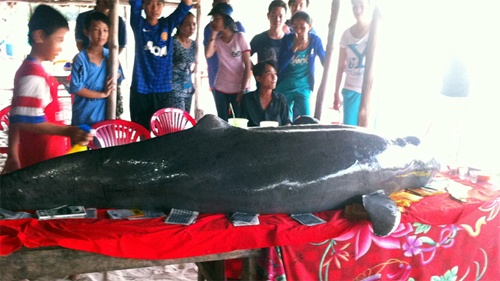 | Con cá heo bị nạn được người dân chôn cất theo nghi thức dân gian. |