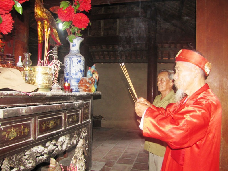 Là người đang trông coi bảo vật vua Hàm Nghi, "cố đạo chủ" - ông Phan Đình Hiền (77 tuổi) thắp nén hương rồi đọc bài cúng Đức Thánh Mậu Trầm Lâm, báo tên từng người đến thăm viếng, cầu chúc cho tất cả thượng lộ bình an, gặp nhiều may mắn.