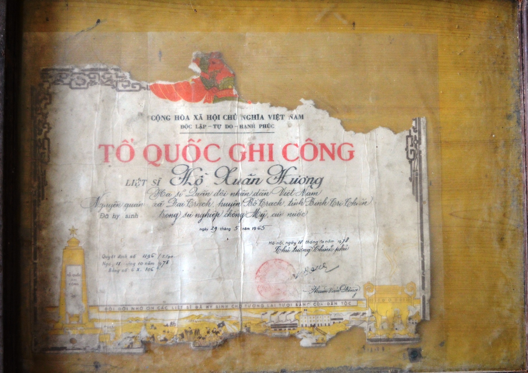 | Tấm bằng Tổ quốc ghi công ghi rõ "liệt sĩ" Hồ Xuân Hương "hy sinh ngày 29 tháng 5 năm 1965". Ảnh: Văn Được. |