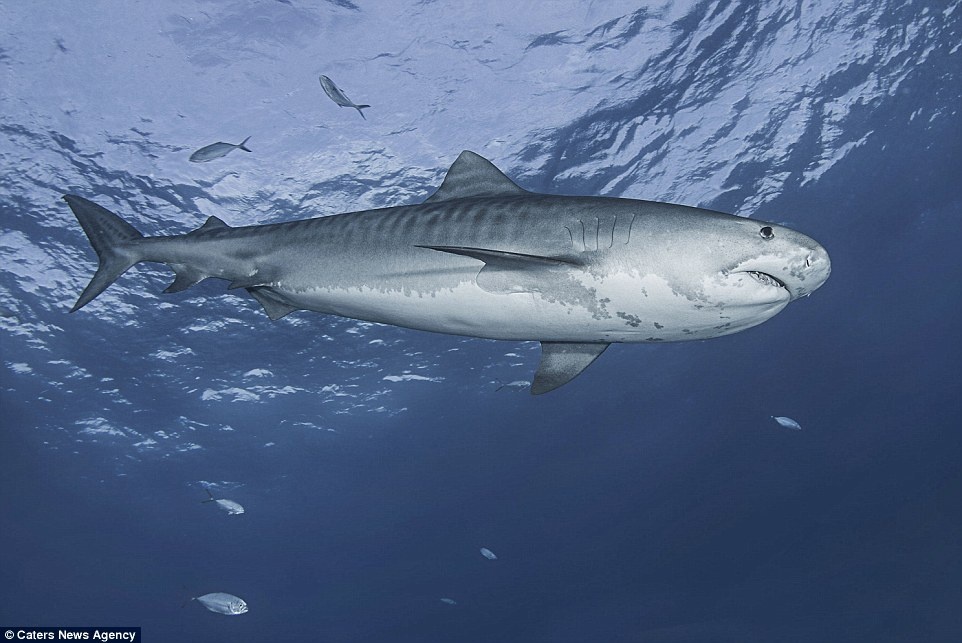 | Đàn cá mập hổ không tỏ ra sợ hãi con người. Ngược lại, chúng còn bơi cùng thợ lặn. |