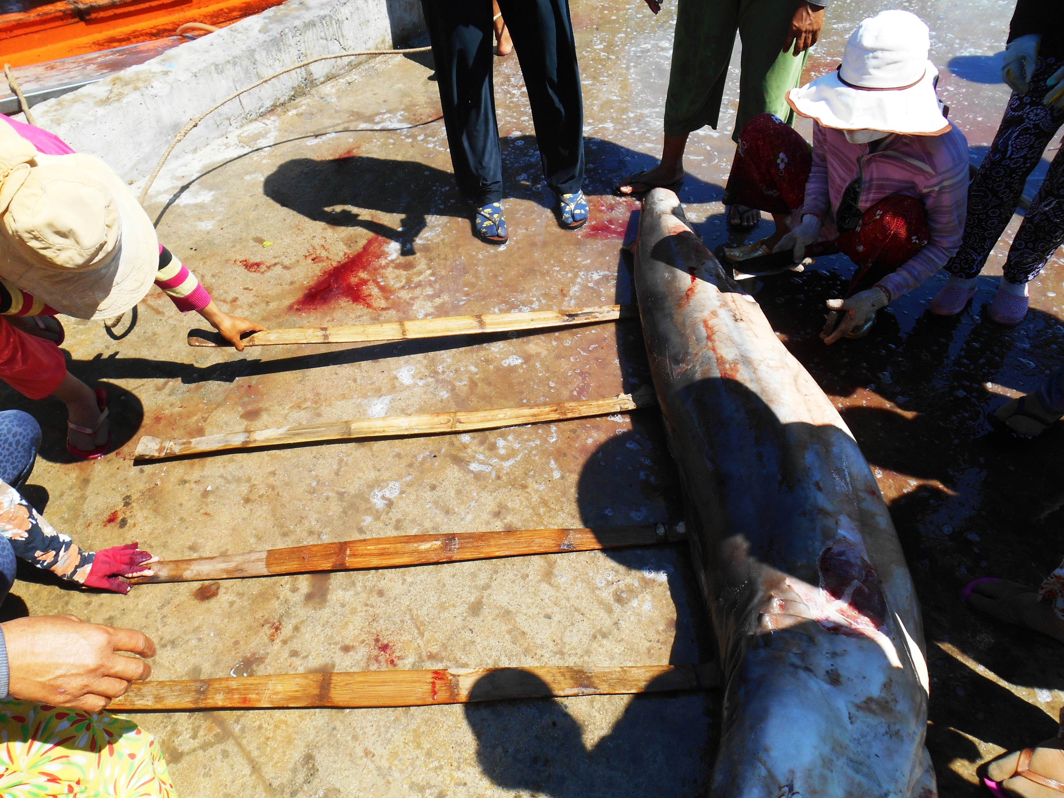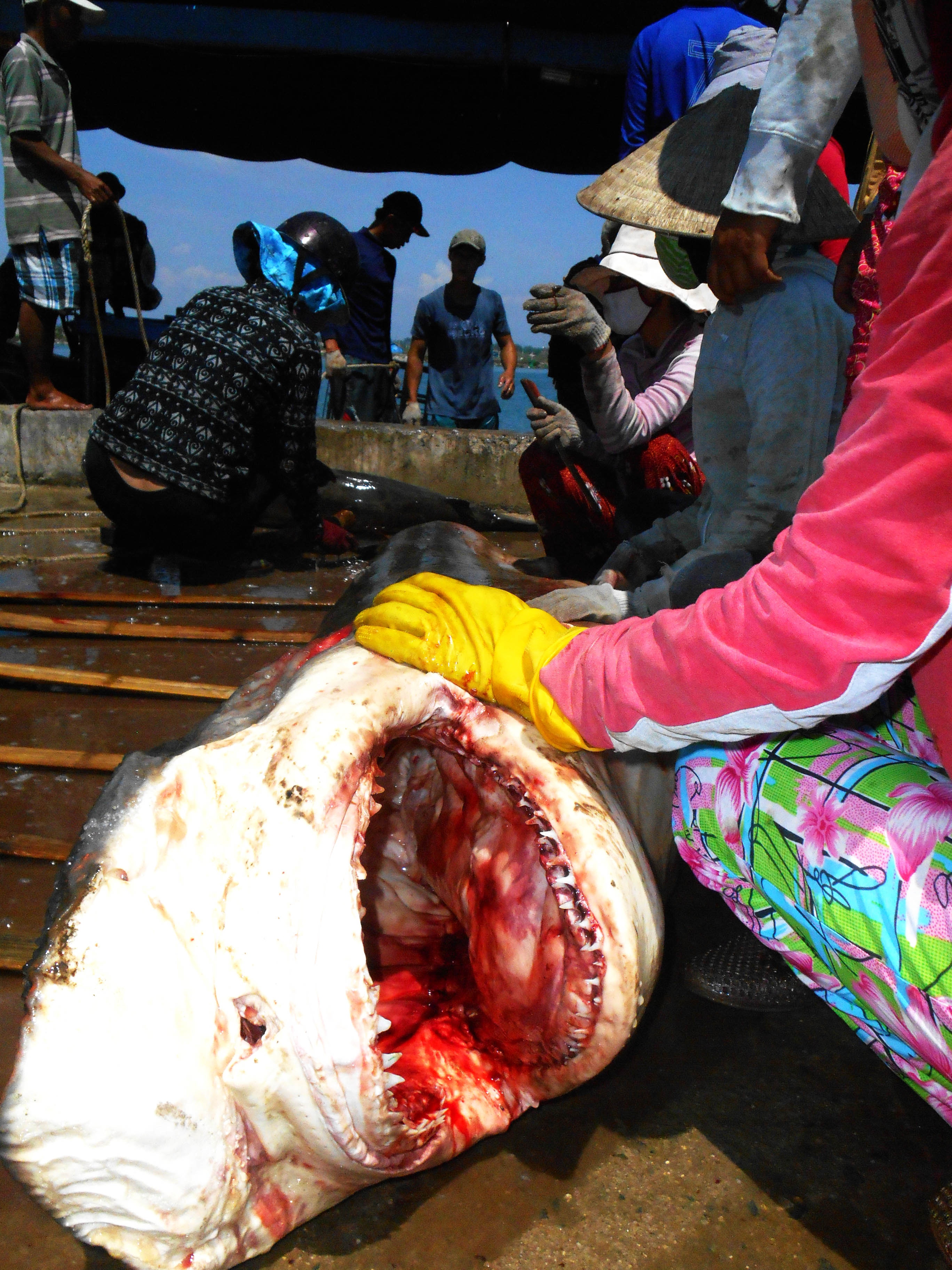 Cá đưa lên bờ được những người phụ nữ nhanh chóng cắt vi vây.
