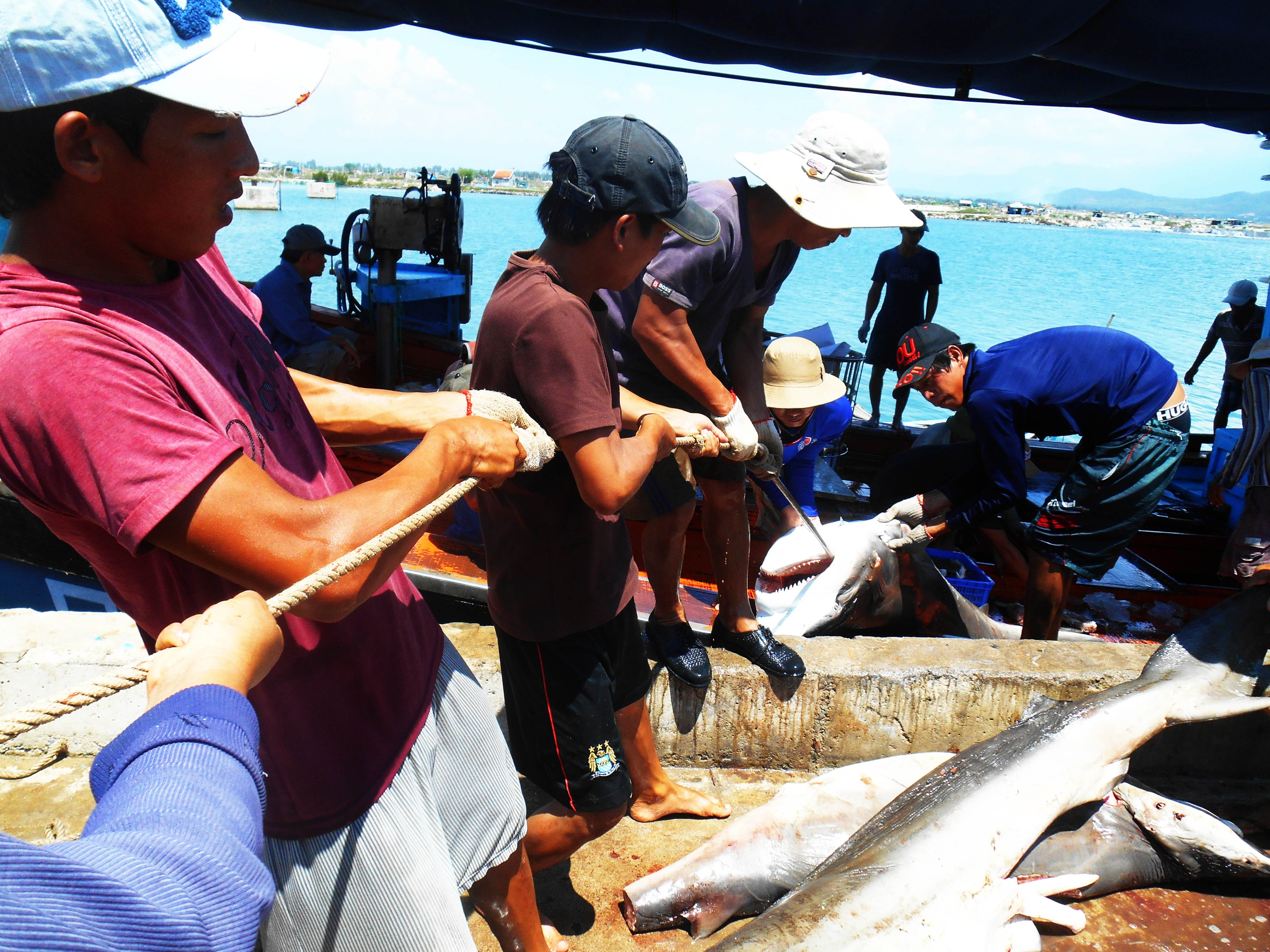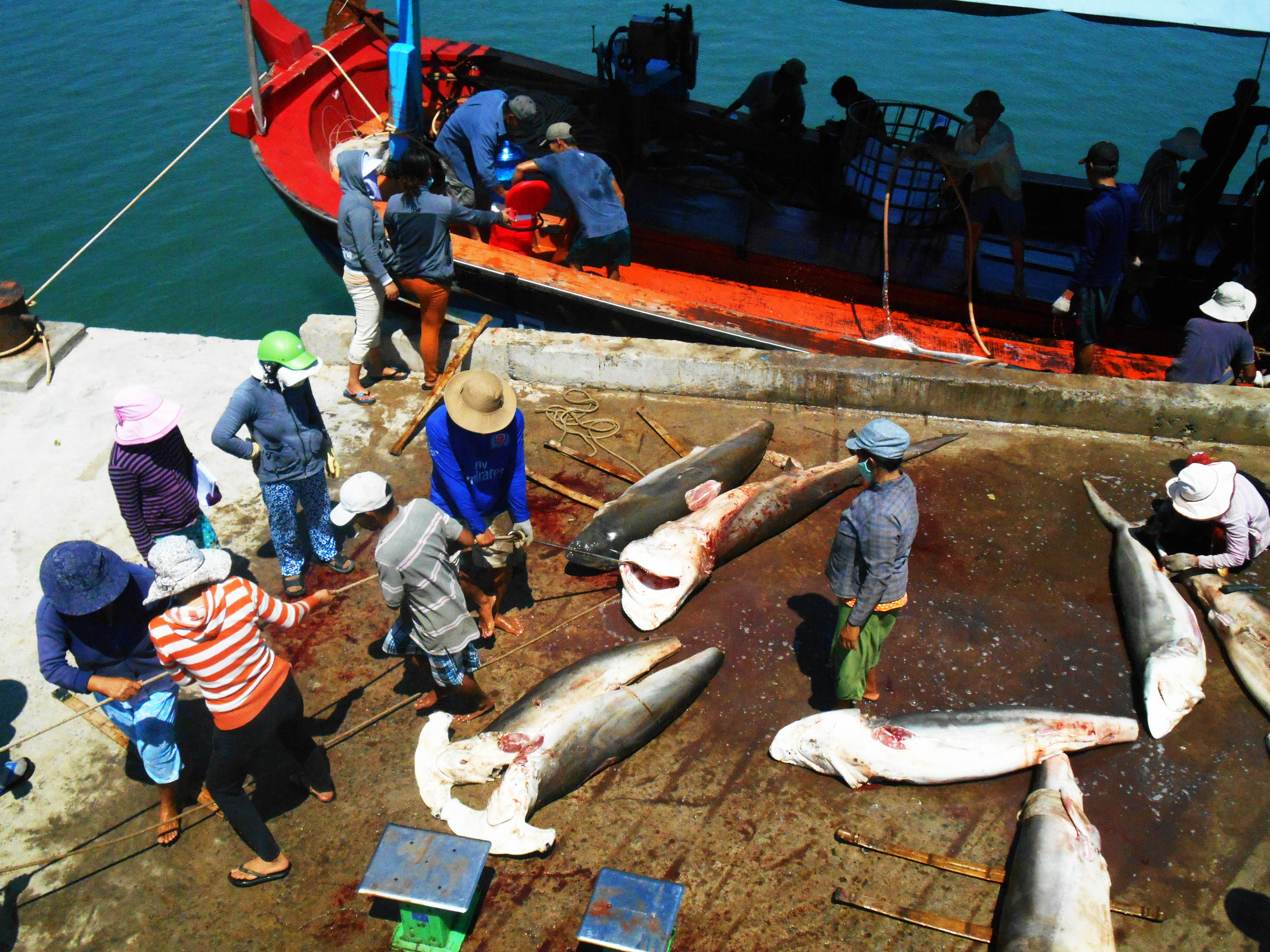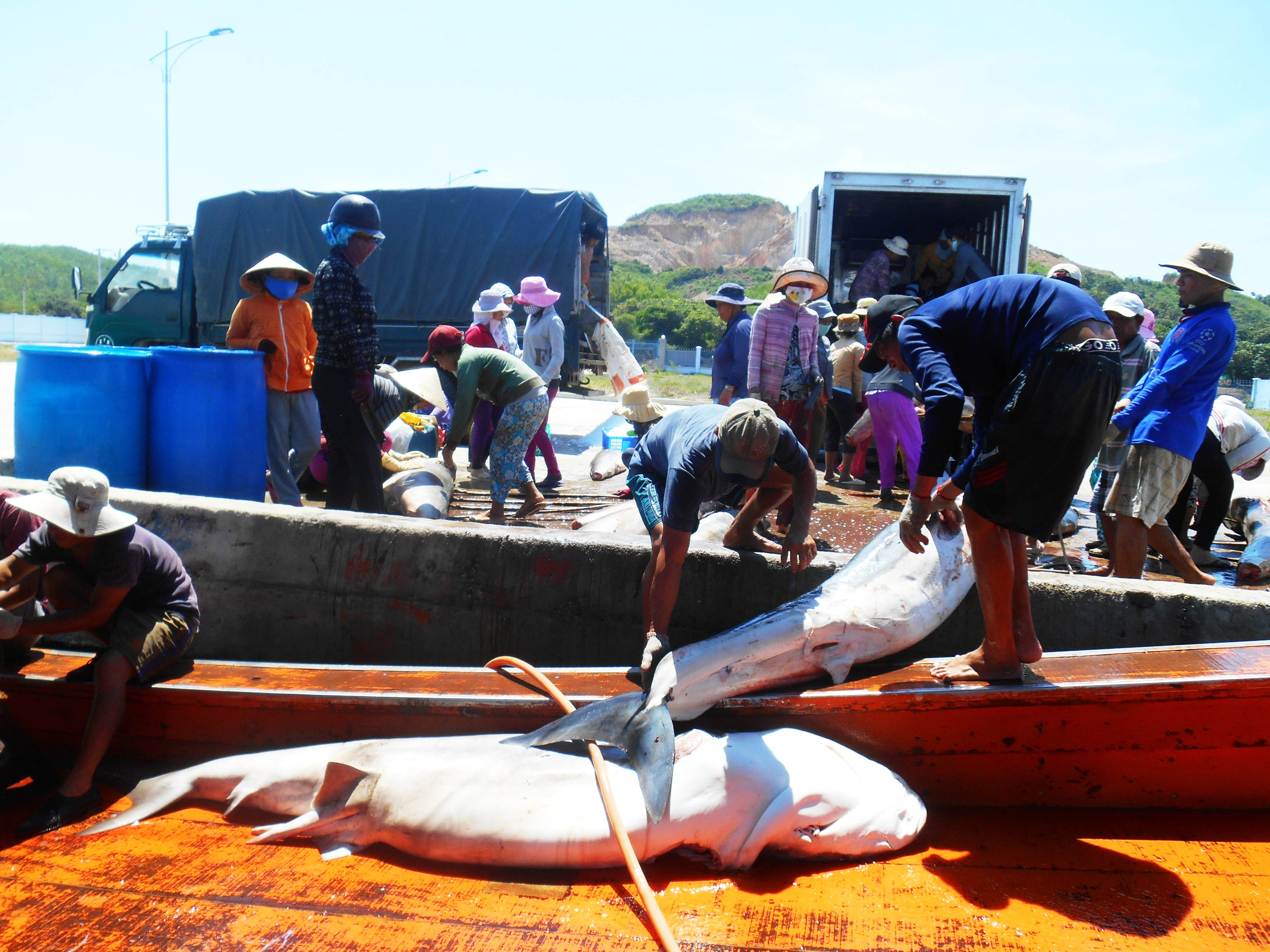 Thương lái tấp nập về cảng để mua cá mập khi thuyền vừa cập bến.
