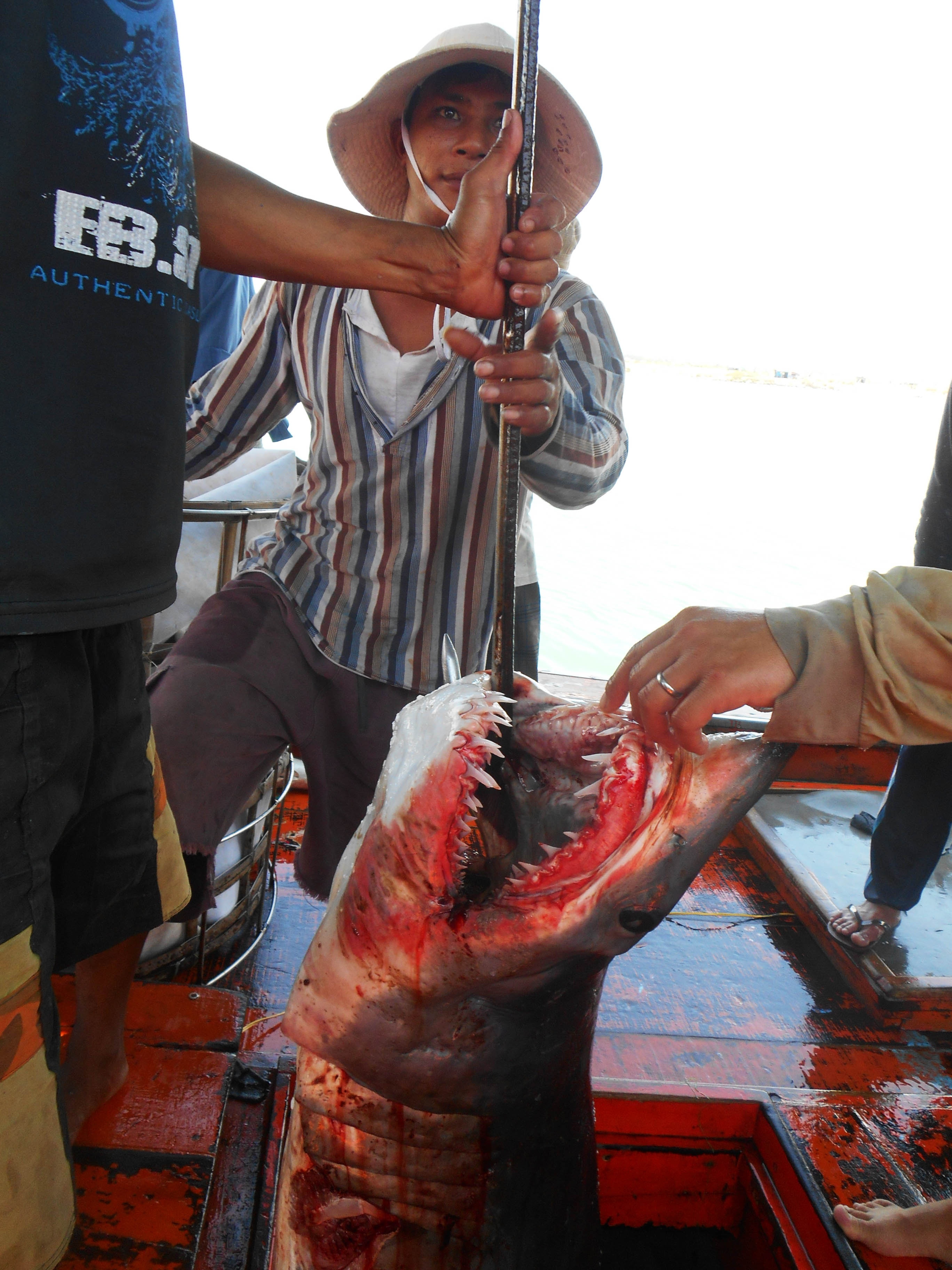 Tiến hành cắt cá mập ra từng đoạn để dễ vận chuyển.