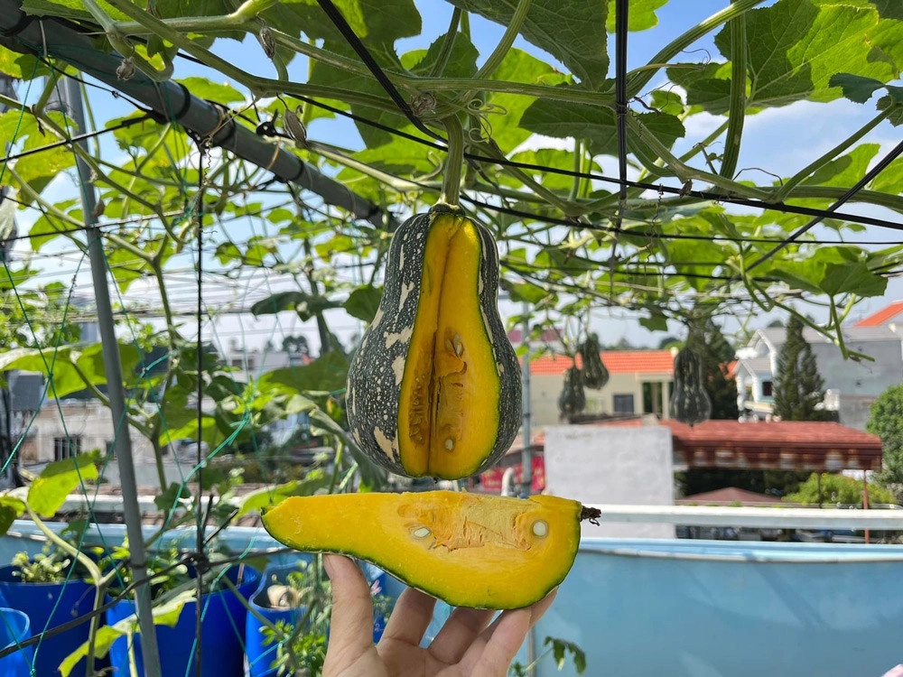 Khi có kinh nghiệm hơn, chị thay thùng xốp bằng thùng phi nhựa để tránh bị vỡ, chảy nước. Để tiết kiệm diện tích, chị còn treo các chậu áp sát giàn để tận dụng không gian, trồng thêm nhiều loại rau. Các thùng phi to, chị trồng cây thân leo như dưa lưới, dưa hấu, dưa lê… Các chậu chị khoan lỗ bên hông cách đáy 5-7 cm, kê sát tường, rào chắn để phòng mưa gió đổ cây. Rau xanh chị trồng trong các khay nhựa hoặc chậu treo để tiết kiệm diện tích.