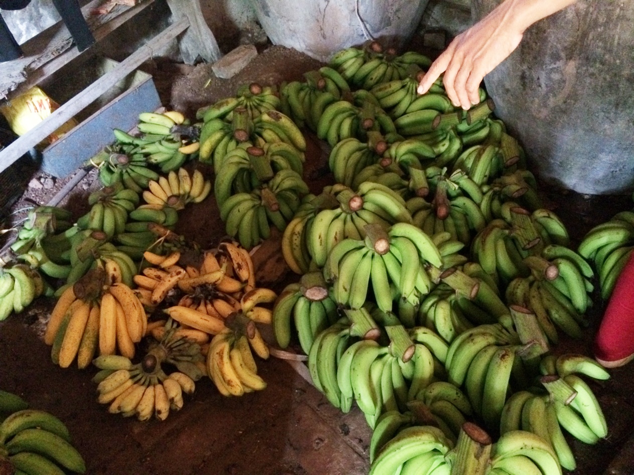 Chị Tám ngừng thuê người làm. 4 công nhân không có nguồn thu. Những buồng chuối chín rũ phải đem cho lợn, gà ăn.