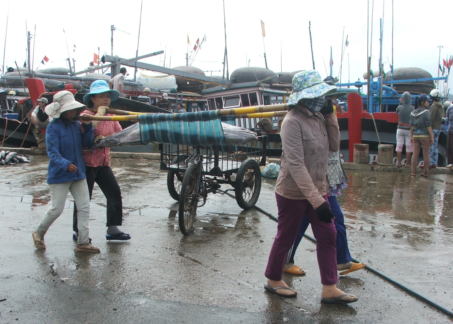 Ngư dân bến cá phường 6 chuyển cá lên bờ sau chuyến đi biển 1 tháng.