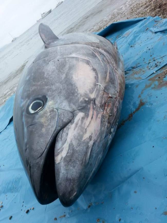 Cuối cùng, nhân viên của Cơ quan Quản lý Hàng hải Anh đến và mang cá ngừ khổng lồ đi trước sự tiếc nuối của 5 cô gái. Các nhà khoa học ở Đại học Exeter sẽ nghiên cứu để tìm hiểu về cái chết của thủy quái này. Ảnh: SWNS. |