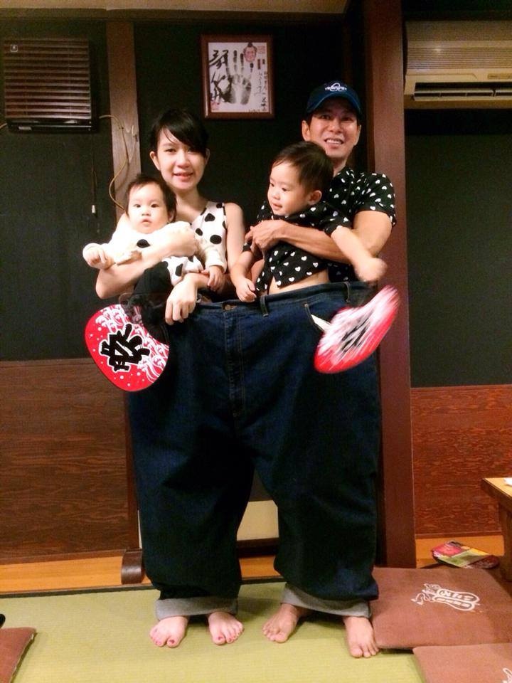 | Bà xã xinh đẹp của nam ca sĩ chú thích ảnh đầy hài hước: "Ăn lẩu sumo, mượn quần jeans của chú sumo mặc 4 người chui vừa 1 cái quần, còn cái lẩu nghe đồn một chú sumo ăn 4 cái lẩu còn mình thì một cái 4 người ăn đã no". |