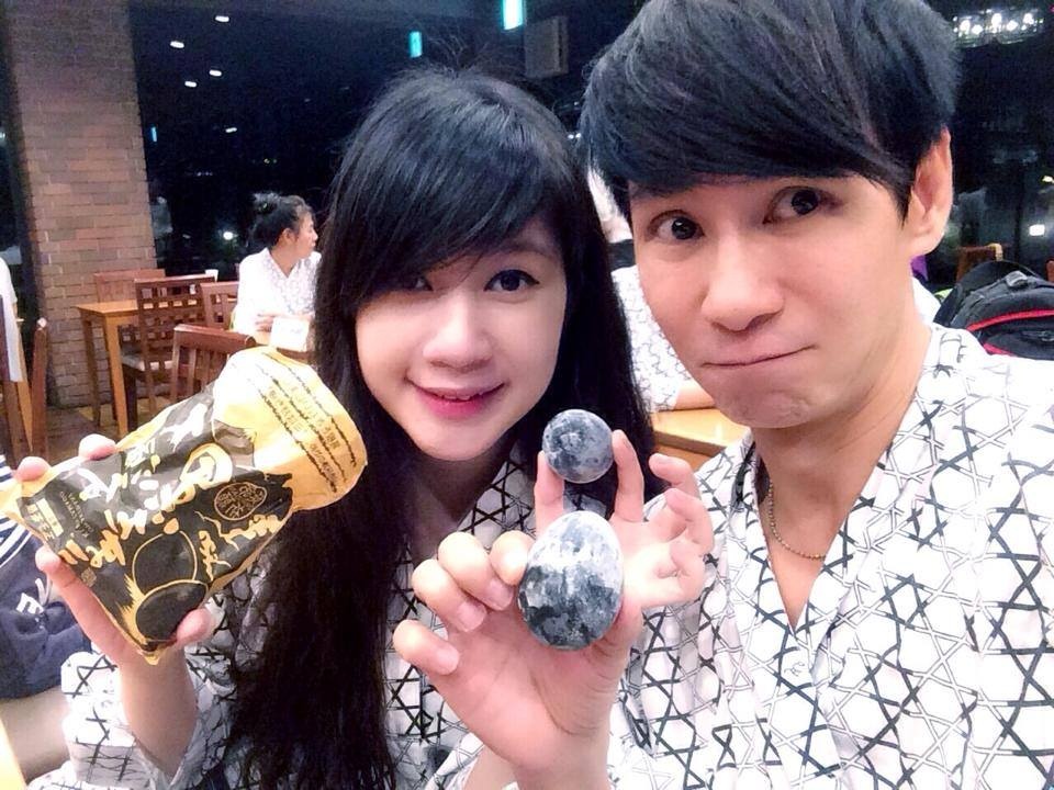 | Bên cạnh việc đi tham quan những thắng cảnh, cặp đôi còn rủ nhau đi tắm suối nước nóng osen. Trong ảnh, Minh Hà khoe hình quả trứng vỏ đen được luộc tại thung lũng owakudani. |