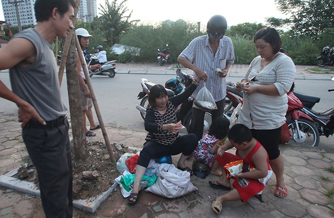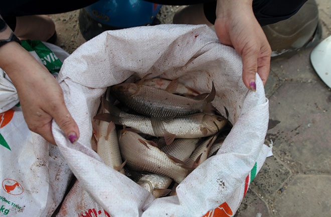 Gia đình chị Lanh ở Đa Sỹ, Hà Đông huy động 5 thành viên tới đây từ 11h trưa. Hai người đàn ông dùng điện ắc quy vợt bắt cá, hai mẹ con đứng sau chỉ việc nhặt cá cho vào bao tải và bán. |