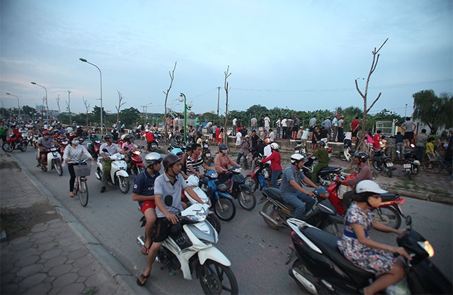 | Bên sông Nhuệ đoạn chảy qua đập Điều tiết nước Thanh Liệt của Công ty TNHH Nhà nước một thành viên Thoát nước Hà Nội hàng trăm người kéo đến đánh bắt cá. |