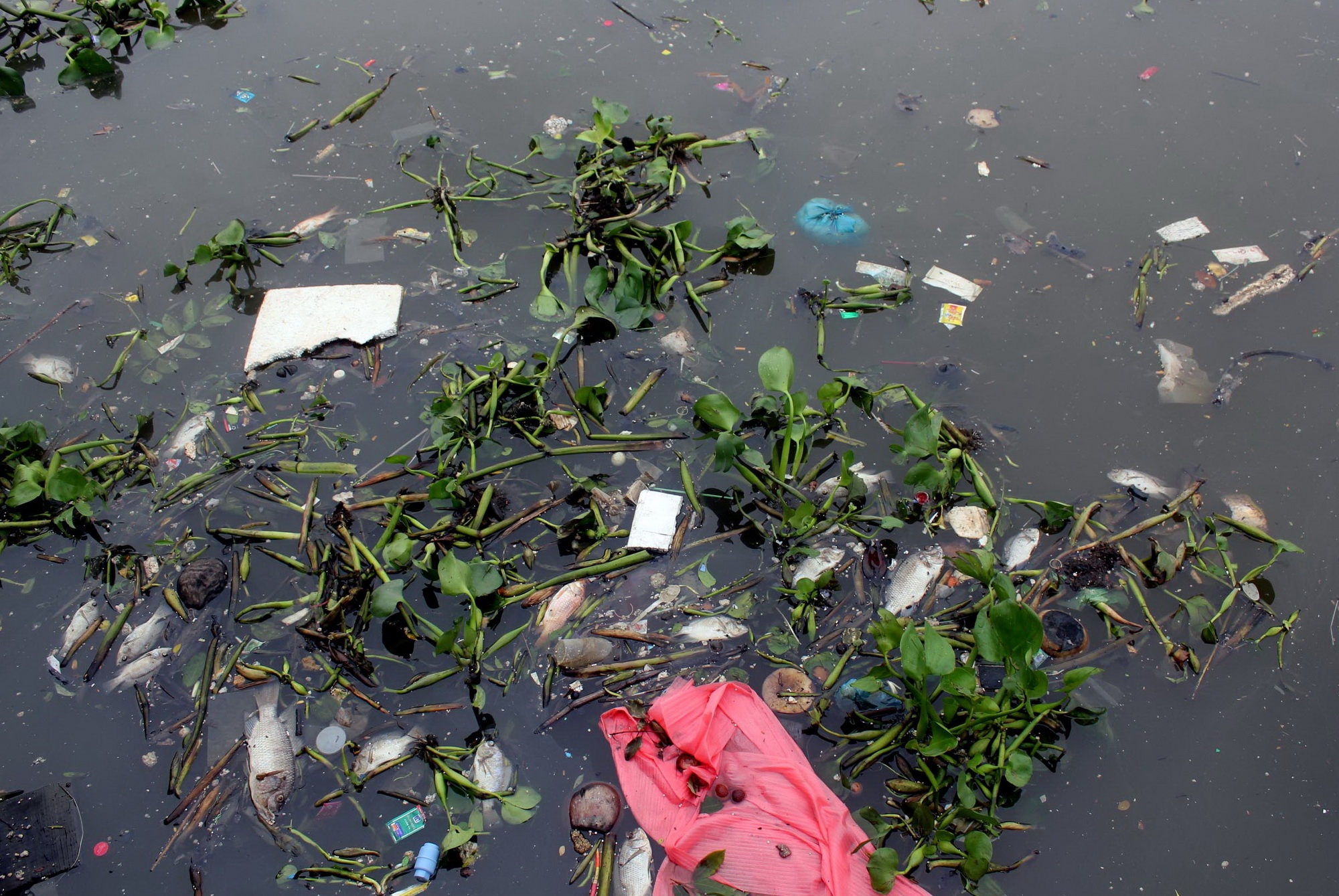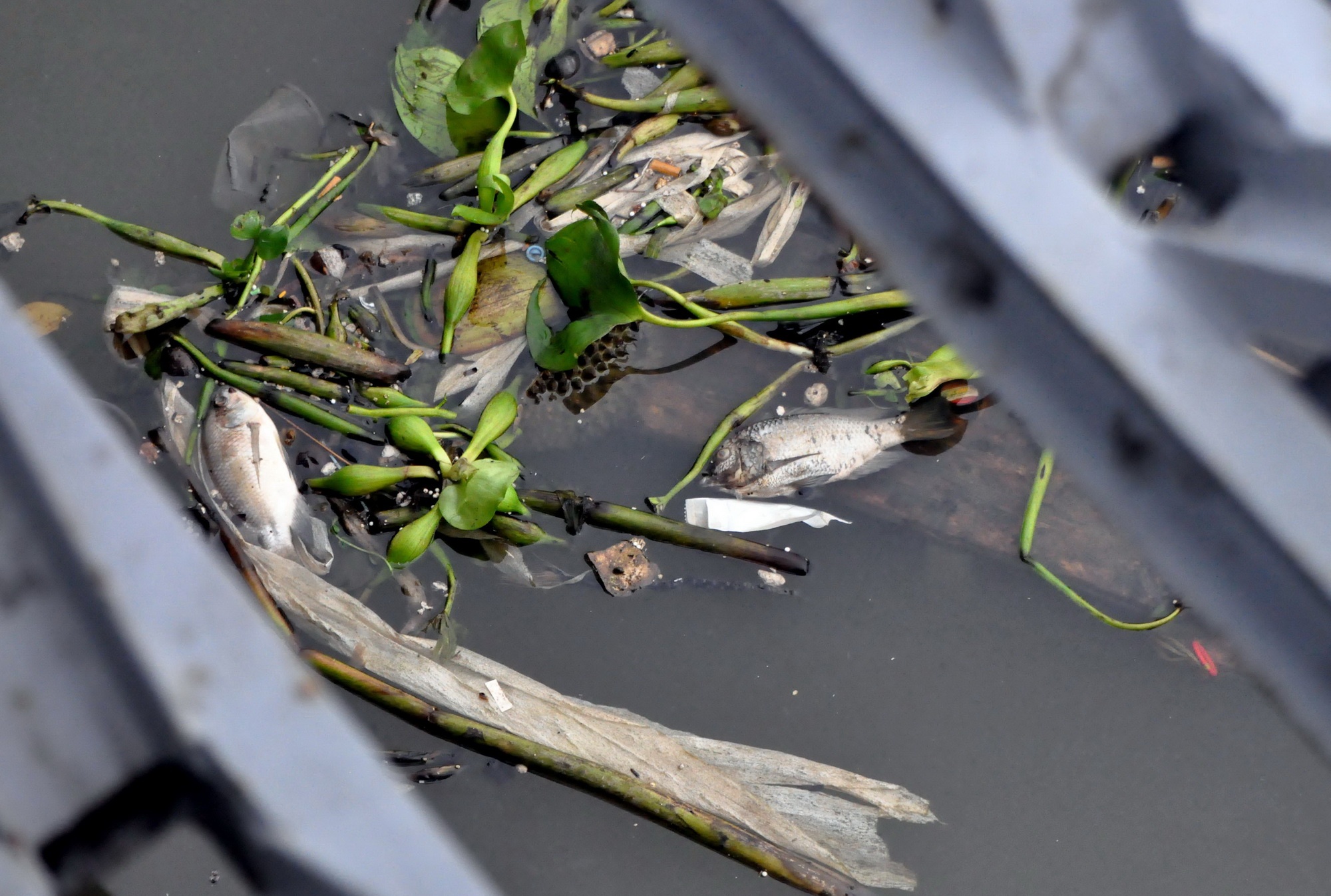 | Suốt dọc con kênh này, tuy thủy triều lên nhưng dòng nước lại đen kịt, các loại rác, bèo trôi lềnh bềnh lên phía cuối dòng kênh, rất nhiều cá chết trương phình cũng trôi theo. Loài bị chết nhiều nhất là cá rô phi. |