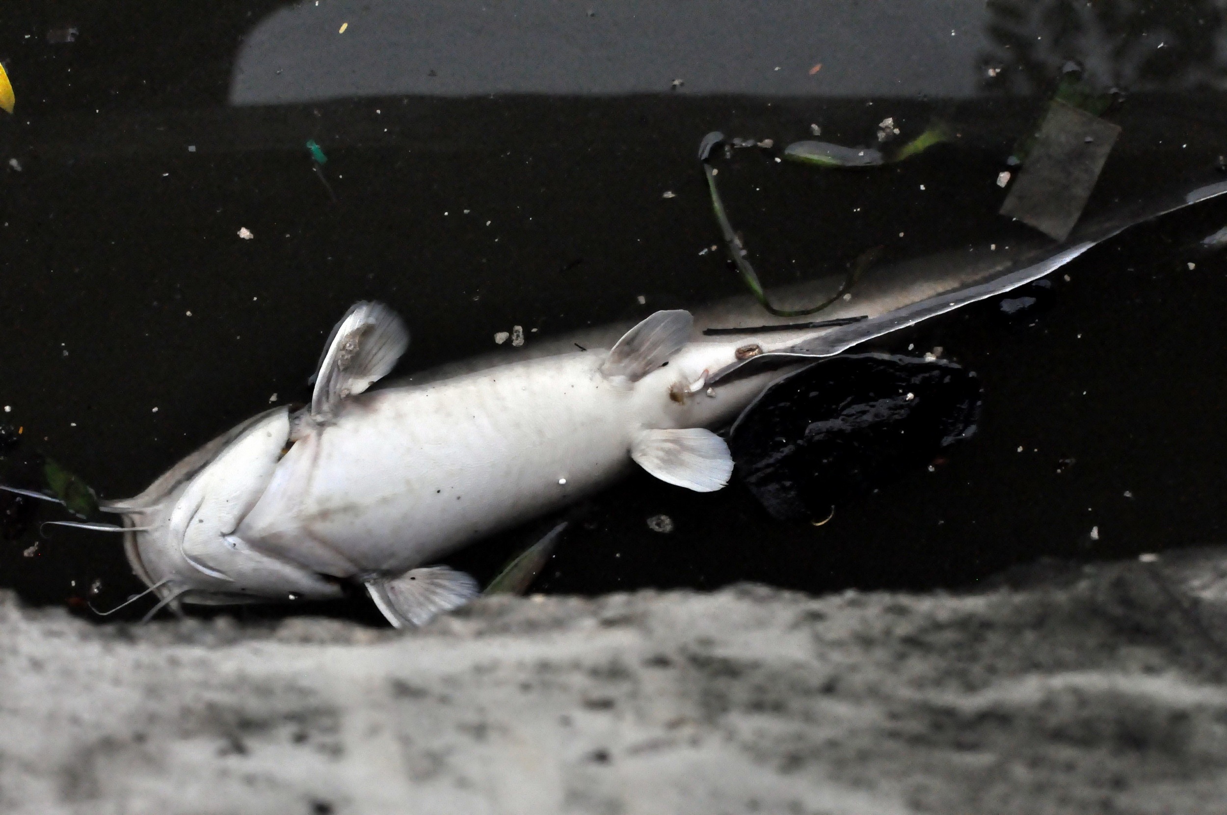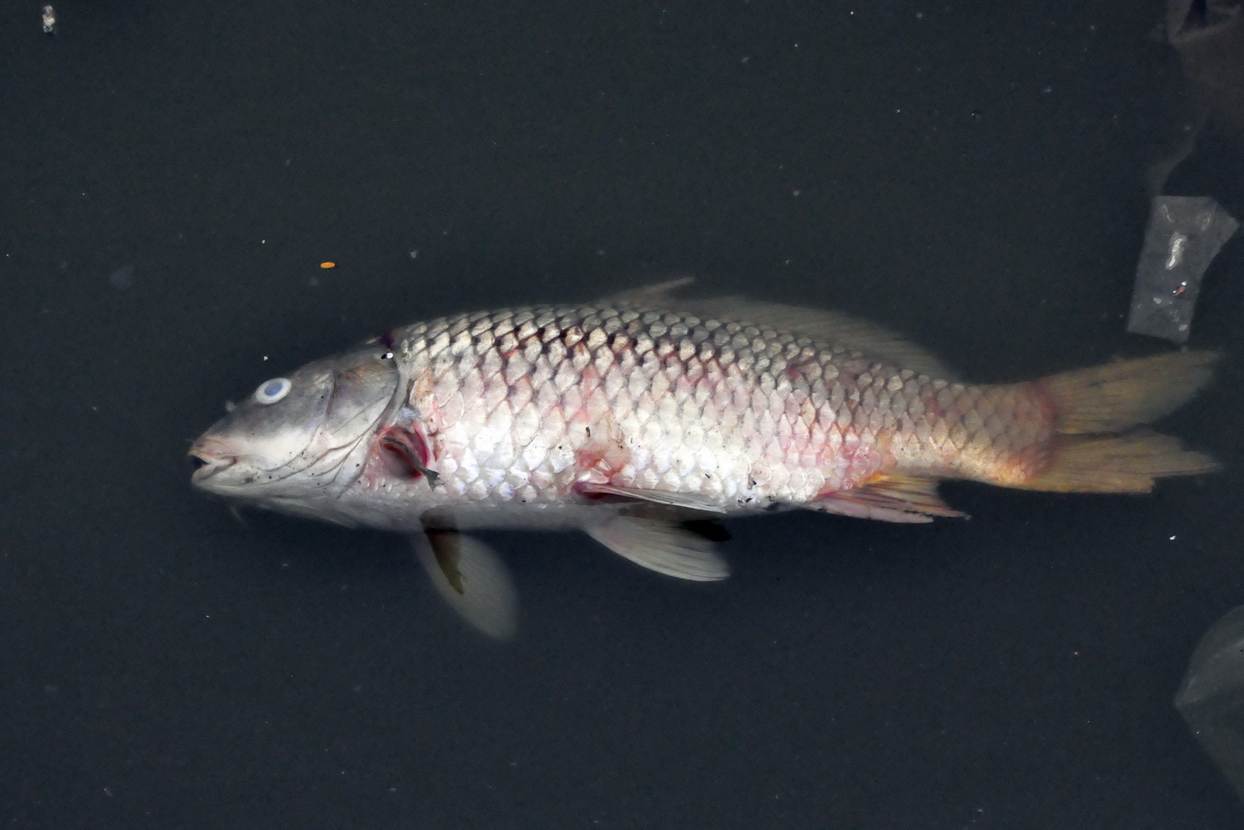 | Một con cá chép khá lớn chết trôi lềnh bềnh giữa dòng nước đen. |