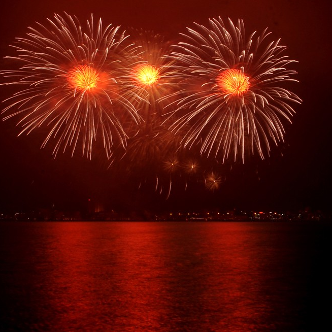 | Pháo hoa trên Hồ Tây (Hà Nội). Ảnh: Hoàng Hà. |