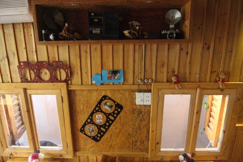 Nội thất bên trong thùng container được chủ quán dán gỗ cách nhiệt.