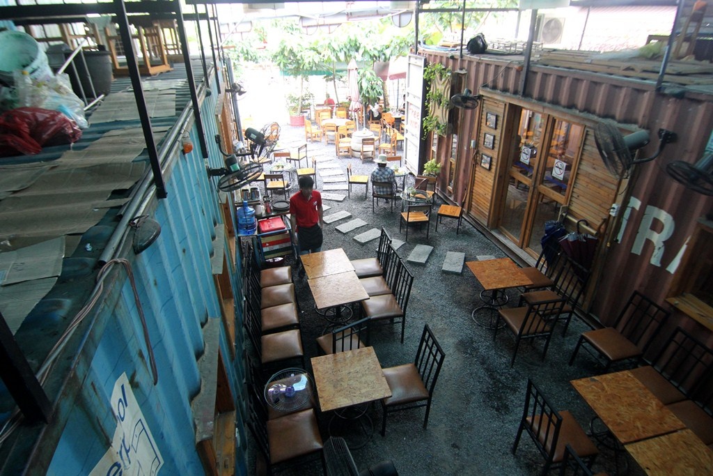 | Các thùng container được chủ quán khoét nhiều lỗ, gắn kính, trang trí cây xanh, gỗ ở bên ngoài. |