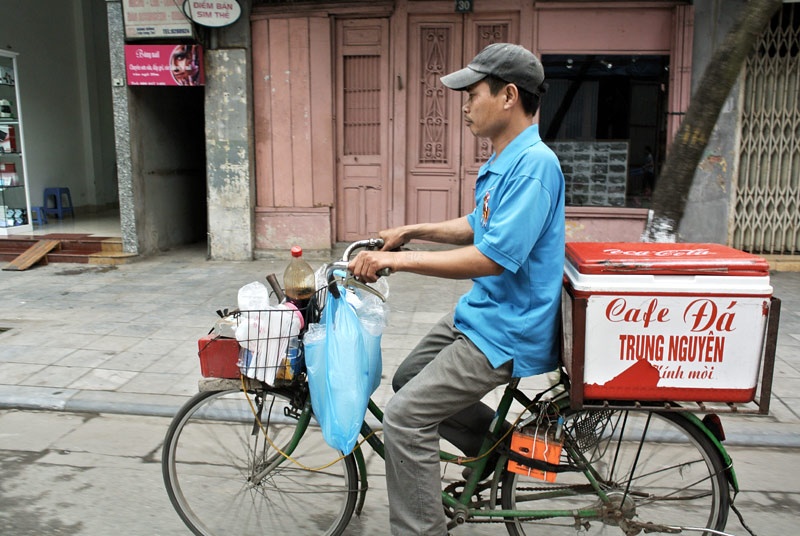 Khoảng 6h hàng ngày, anh Trần Văn Triệu thoăn thoắt đạp xe khắp khu phố cổ Hà Nội bán dạo cà phê, hoặc lúc đạp, lúc dắt luồn lách khắp ngõ phố. |